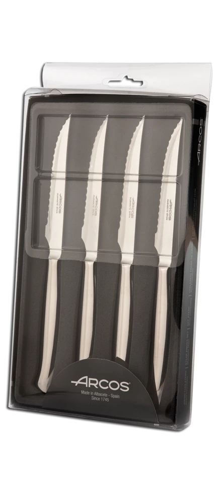 Equip your kitchen and your dining table with this Arcos steak knife set. It includes 4 top-quality steak knives that you can use to cut every type of meat with the minimum effort required. In addition, its elegant design will add a modern touch to the decoration of your table !
