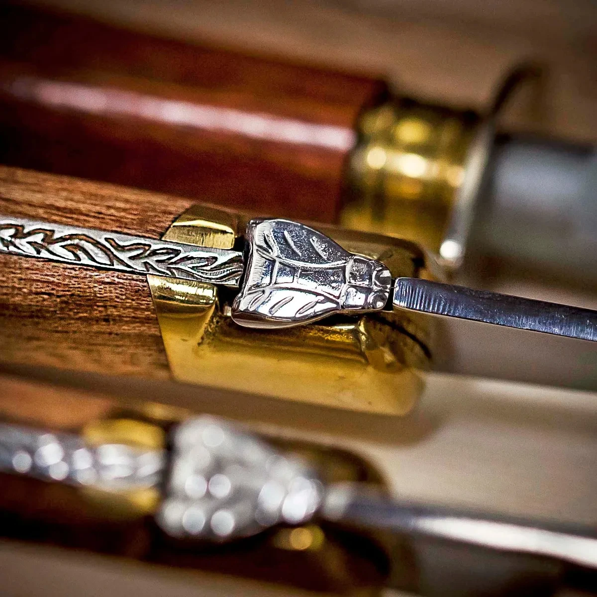 With the famous Laguiole bee sitting prominently on the brass bolster, this set offers a stunning way to carve and present your meats. The long steel blade is accented with small detailed shaping and contrasts the brass bolster and rivets. The spine of the knife and fork feature an eye-catching decorative pattern making this a timeless gift which will be treasured.