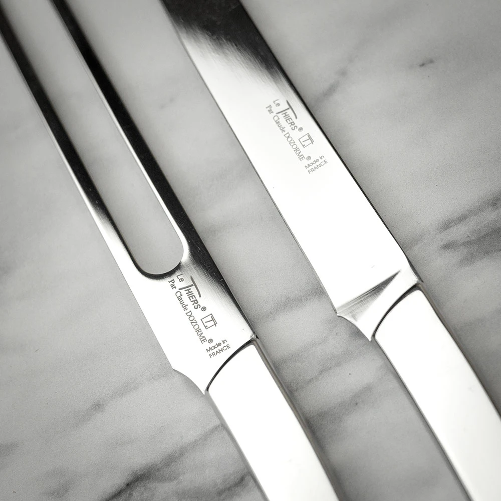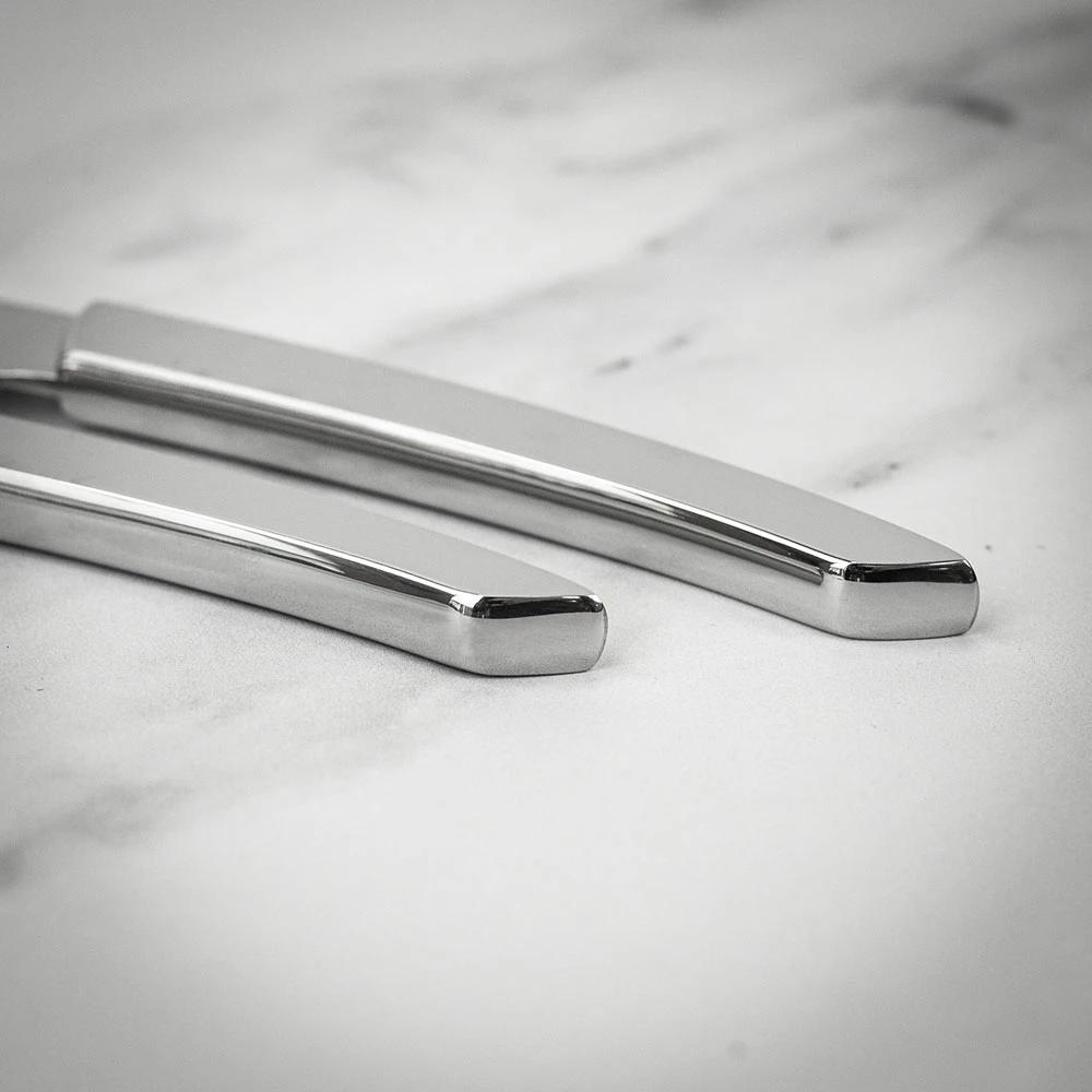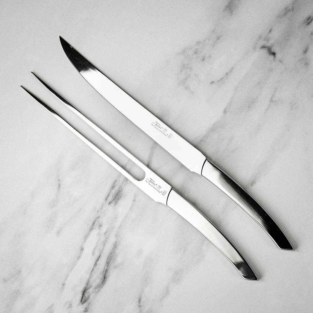 Beautifully hand forged from the finest quality polished finish stainless steel. A full-tang blade on the knife and prongs on the fork, combined with triple riveted handles, offer superior strength.