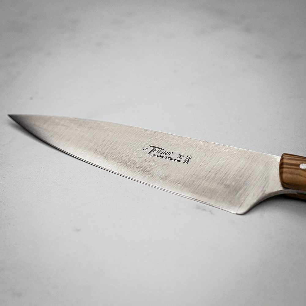 Produced in Thiers since 1902, Claude Dozorme knives have a history of quality which is evident in this Le Thiers carving knife. Providing a luxuriously comfortable grip thanks to its slightly curved handle, this ergonomically designed masterpiece will allow you to cut large pieces of meat and chunky vegetables with precision and ease. A stunning addition to your kitchen drawer, this 15cm knife boasts a beautifully sleek olive wood handle, each unique due to its natural qualities, and features an exceptionally sharp stainless steel blade, which can be easily resharpened to maintain its superior quality.