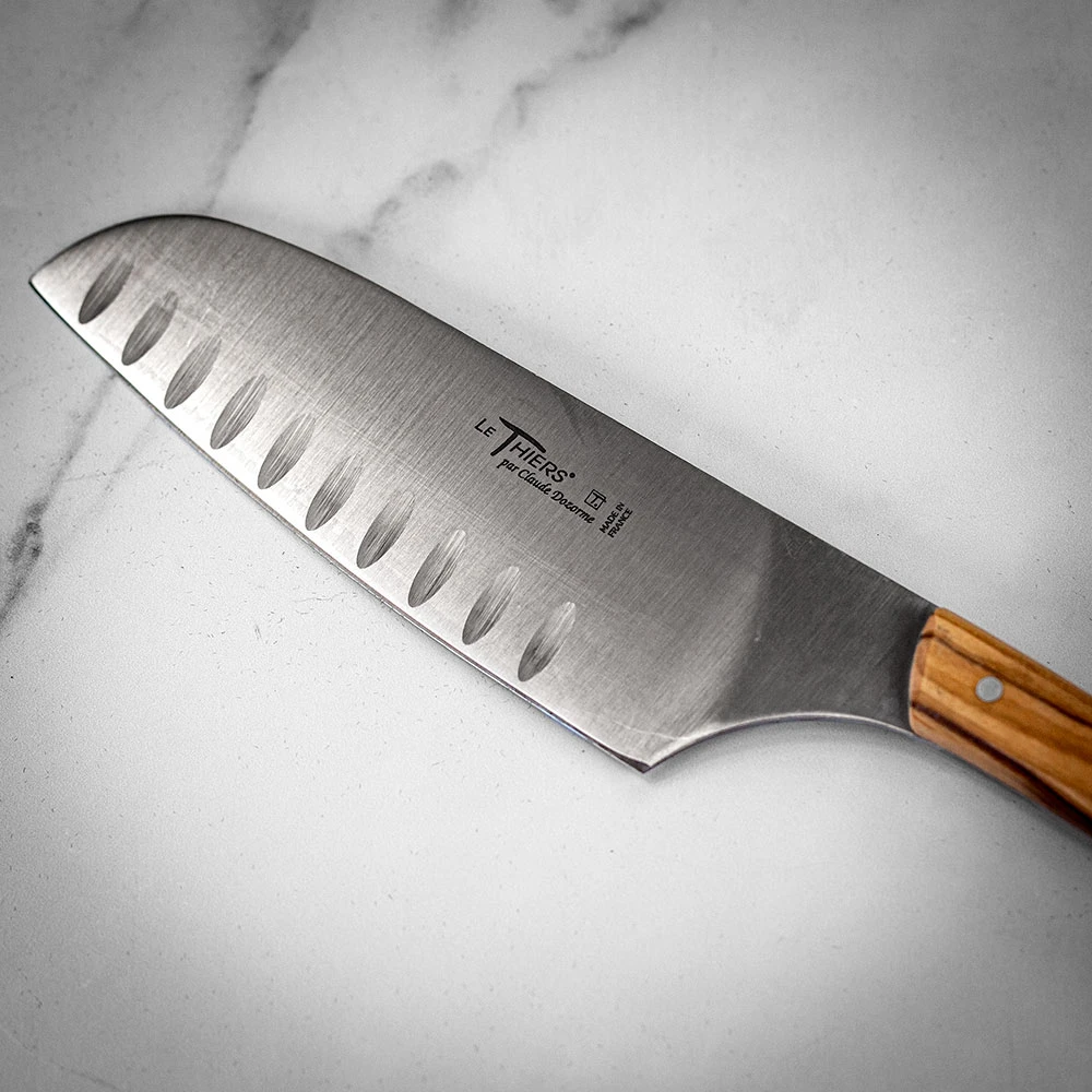 This scalloped santoku razor sharp blade can cut through the toughest of meats with ease. The air pockets (scallops) ensure food doesn’t stick to the sides as you mince, slice and dice. The tripe riveted, curved, full tang handle, finished with a beautiful two-tone olive wood, is a pleasure to use.