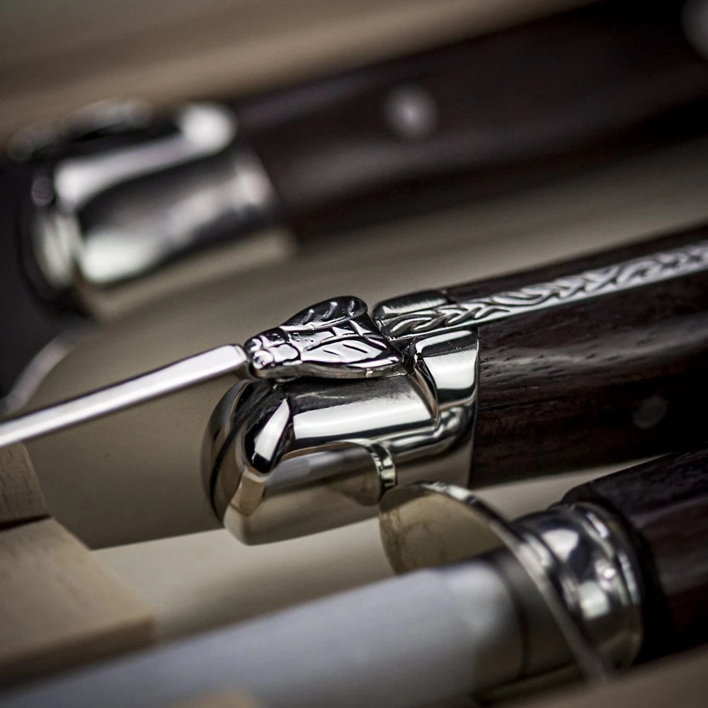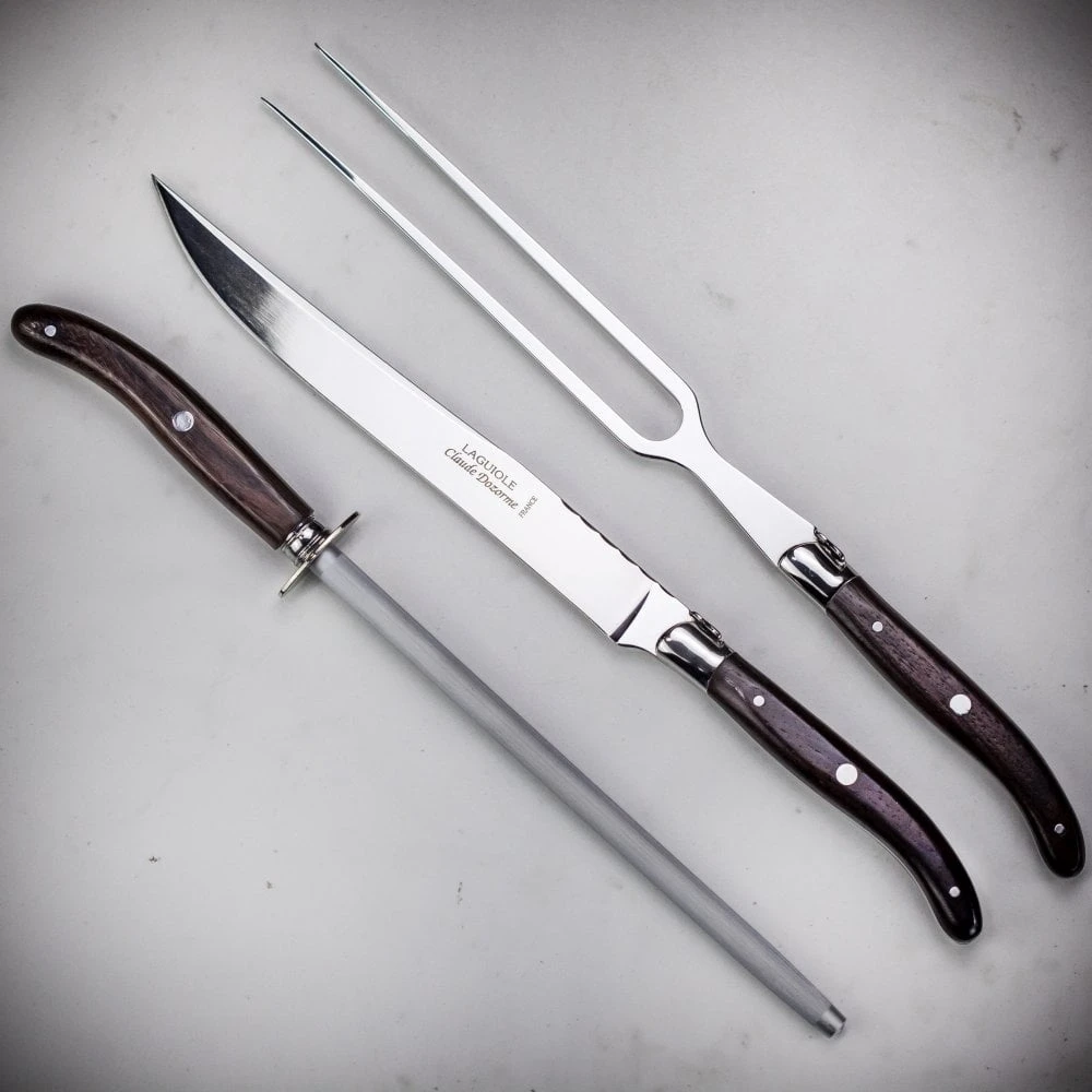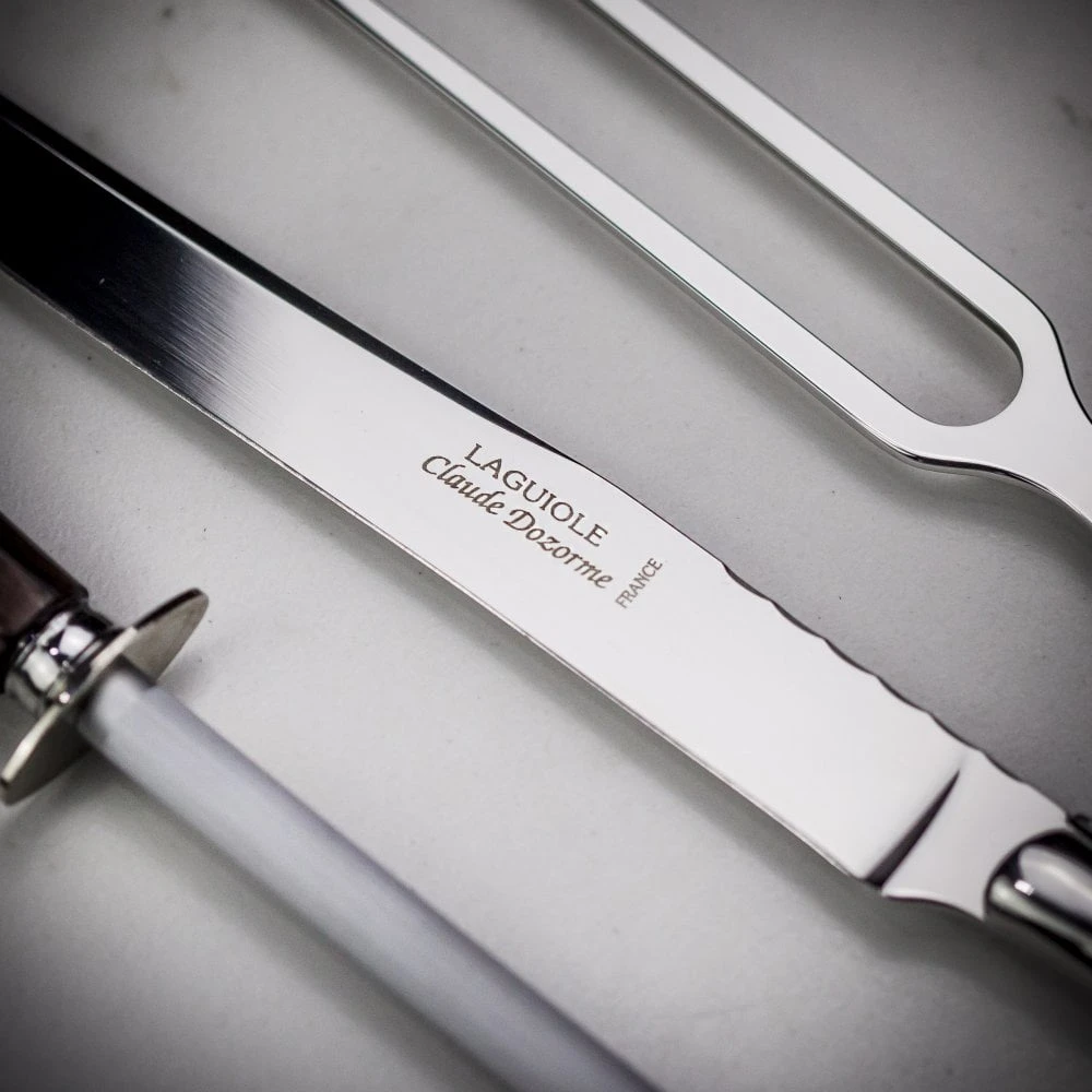 The long steel blade is accented with small detailed shaping and the spine of the knife and fork feature an eye-catching decorative pattern making this a timeless gift which will be treasured.