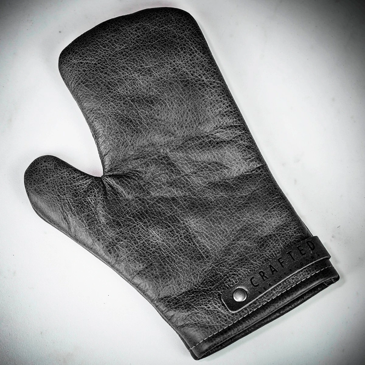 The black leather is soft and supple with a delicate grain. With a hanging strap at the wrist, this utility glove is an ideal gift for grill masters.