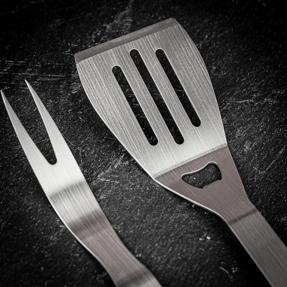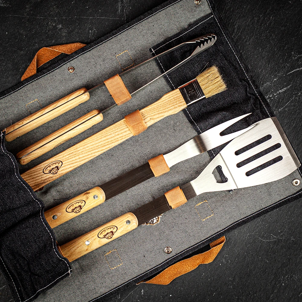 Featuring leather straps to hold the equipment in place, this hard-wearing set is a summer essential. With thick, sturdy handles these tools can be easily transported with you for a BBQ on the beach.