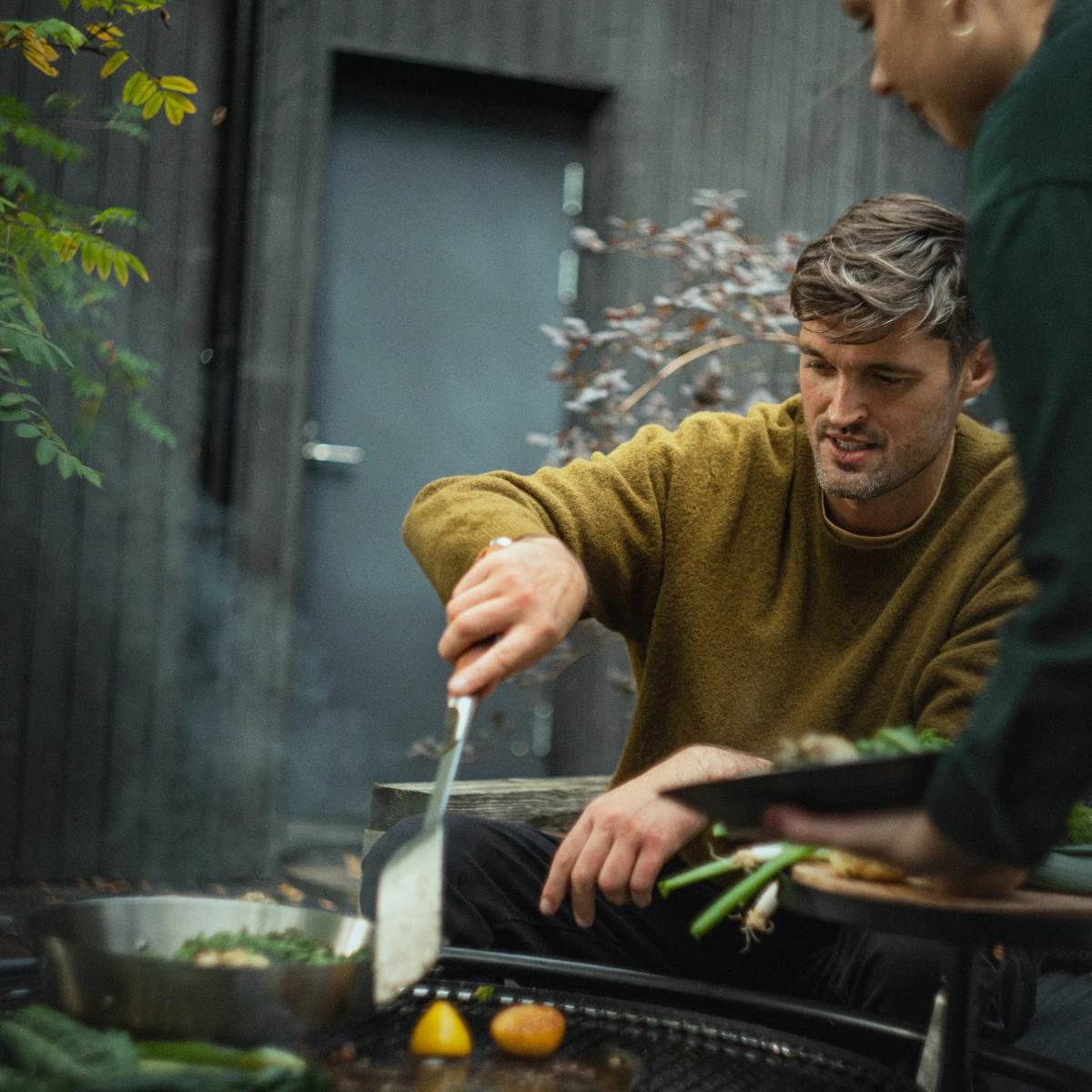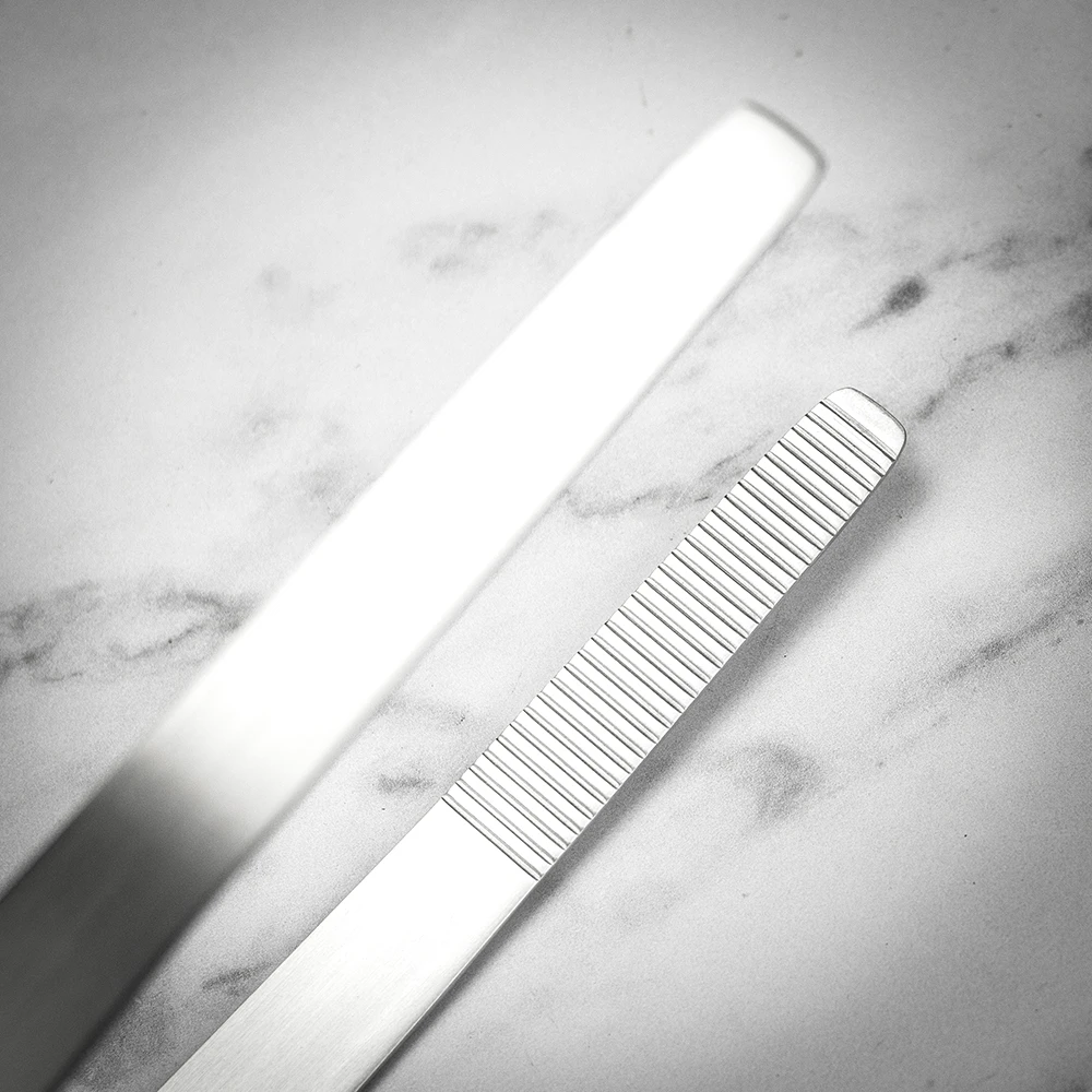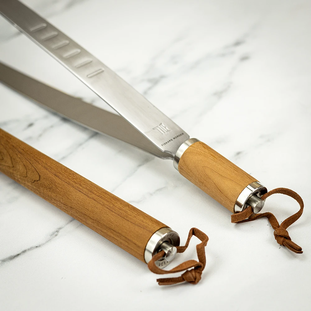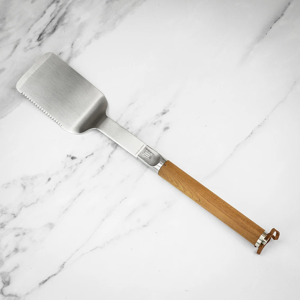 The grill spatula features a versatile serrated edge, a slim end, and tasteful engraved branding. Accompanying it are the grill tongs, which offer a non-warping design, a robust serrated inner surface, and a secure grip for precise control. To preserve their exceptional quality, hand washing is recommended.