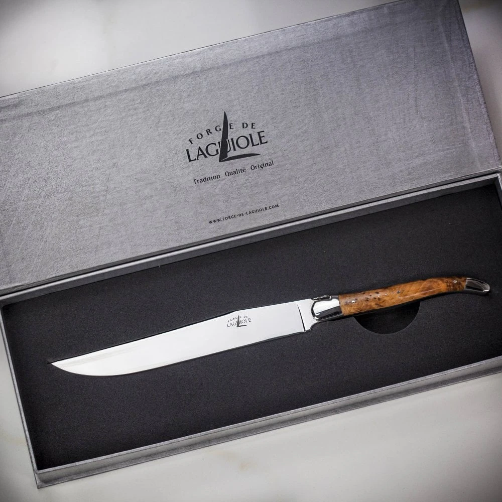 The full-tang blade glides effortlessly through meat with the most satisfying degree of precision, and the perfectly weighted, well-balanced Thuya wood handle is crafted by hand, to form a beautifully ergonomic shape which is a pleasure to hold.