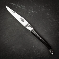 Carefully selected dark horn is carved and finished by hand to create a beautifully ergonomic handle which is a pleasure to hold. A patterned steel spine runs the length, from bolster to bolster and the iconic Forge de Laguiole bee rests just before the blade not only as an integral part of the spring but also as a reassuring symbol of quality.