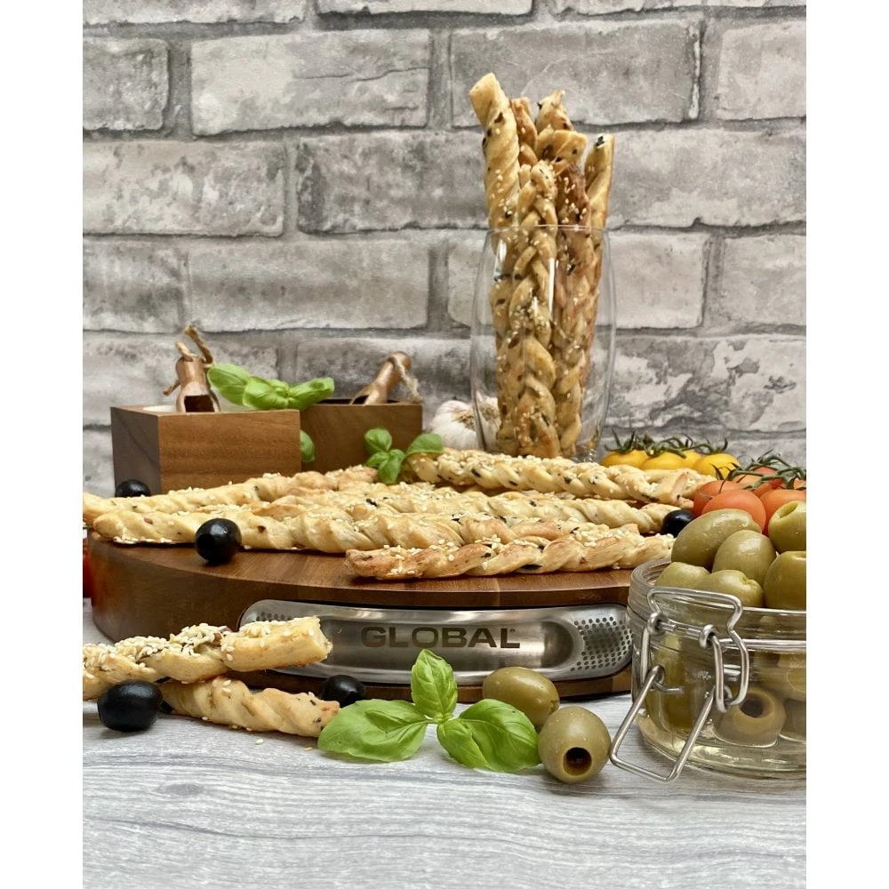 Made from beautiful acacia wood, this chopping board from Global is naturally anti-bacterial and ideal for preparing and serving food. Acacia is a highly durable and water-resistant hardwood that’s also resistant to scratching and warping. Its natural grain lends your kitchen countertop or table a warm, rich look. The board has 18/10 stainless steel moulded handle side panels with the distinctive Global branding of black dots. The craftsmanship is fully guaranteed against defects. Dimensions : 35 DIA x 4.5 cm.
