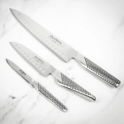 Comprising a 20cm Fluted Chef’s Knife, 13cm Fluted Santoku Knife and an 8cm Peeling Knife, each knife is precision crafted from high quality Cromova18 stainless steel and ice hardened to Rockwell 56-58, beautifully balanced and features an acute 15° cutting edge which holds its razor-sharp edge for longer.