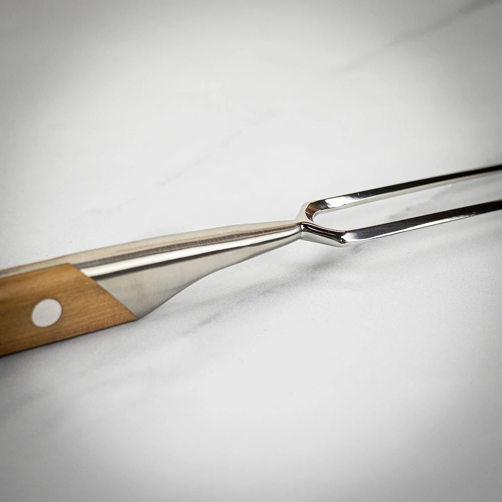 Fully forged in one of the best hardened steels available, this carving set is entirely handmade in France. The razor-sharp full blade cutting edge of the knife will make light work of your carving and slicing, and the durable steel prongs of the fork give exceptional stability as you work.
