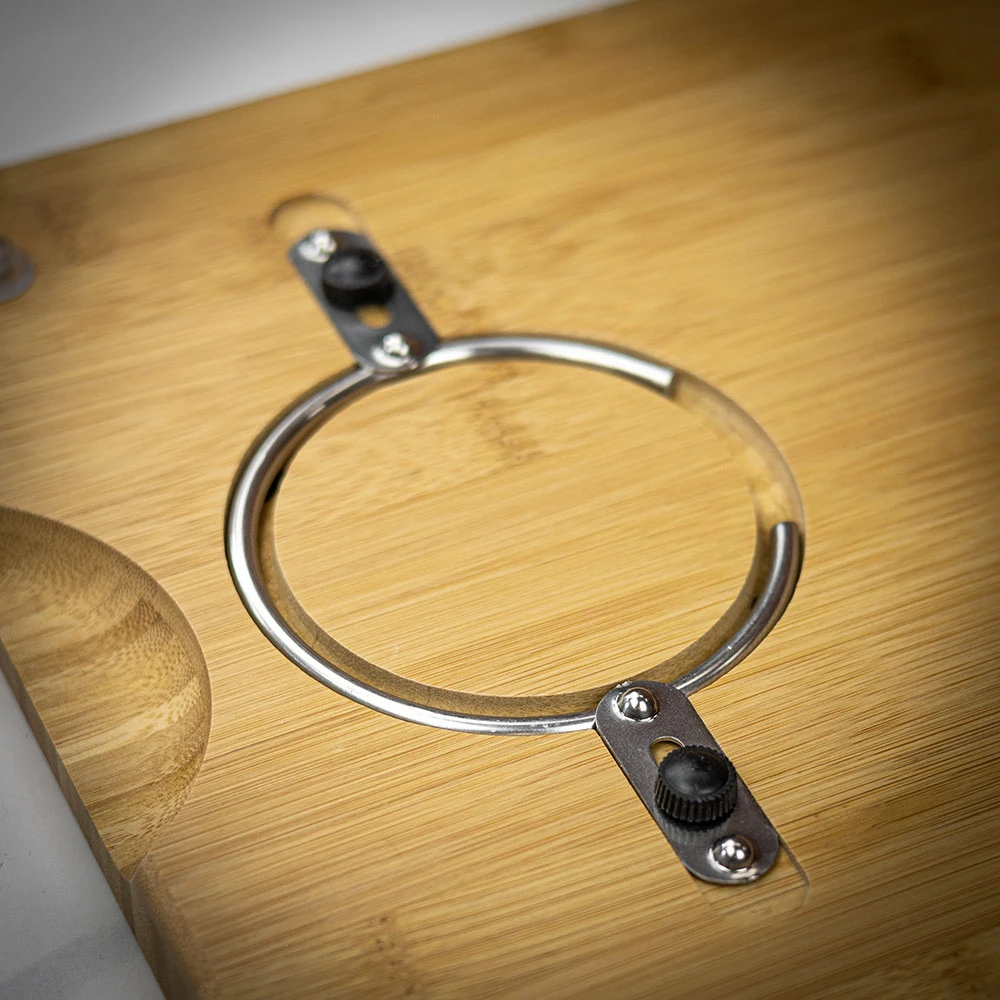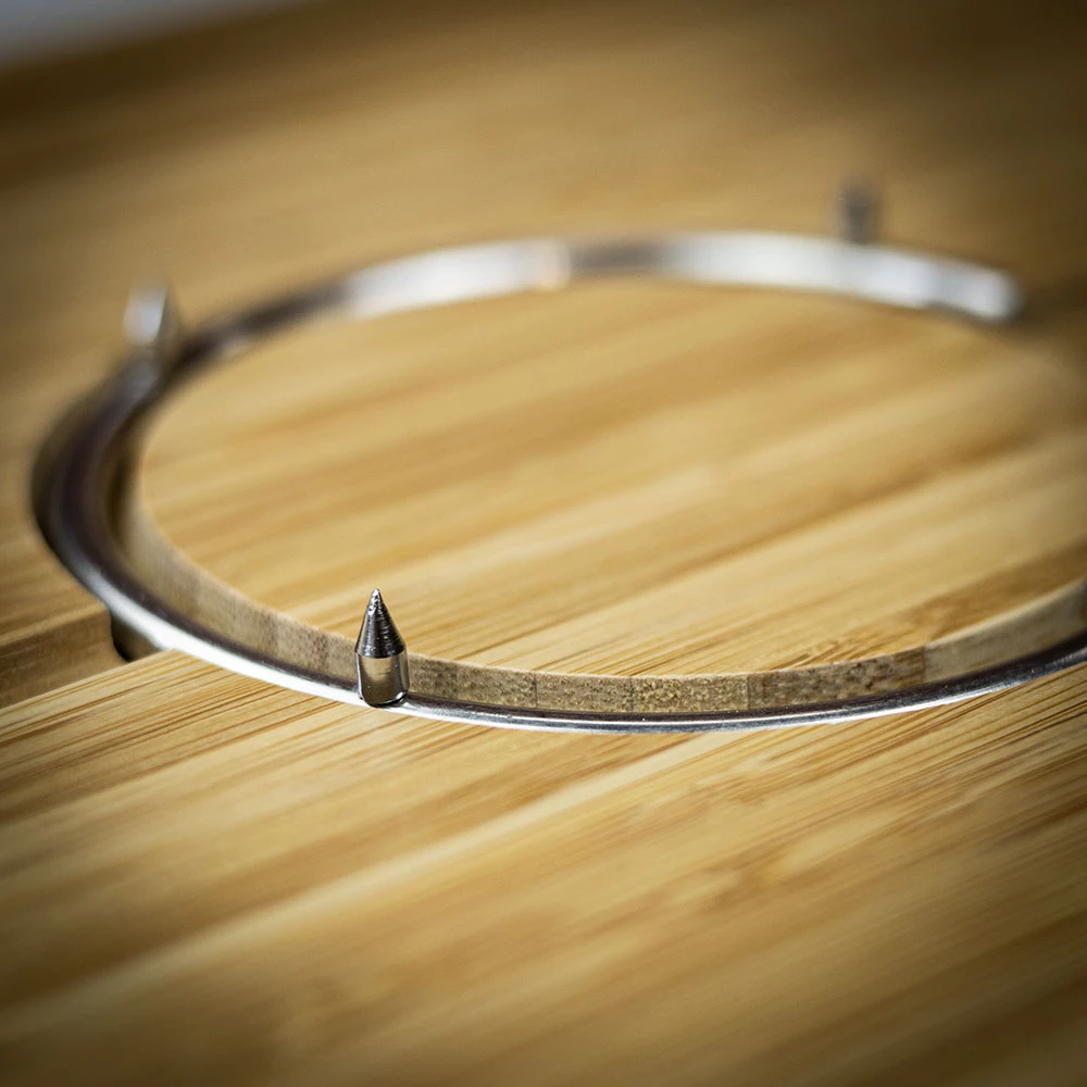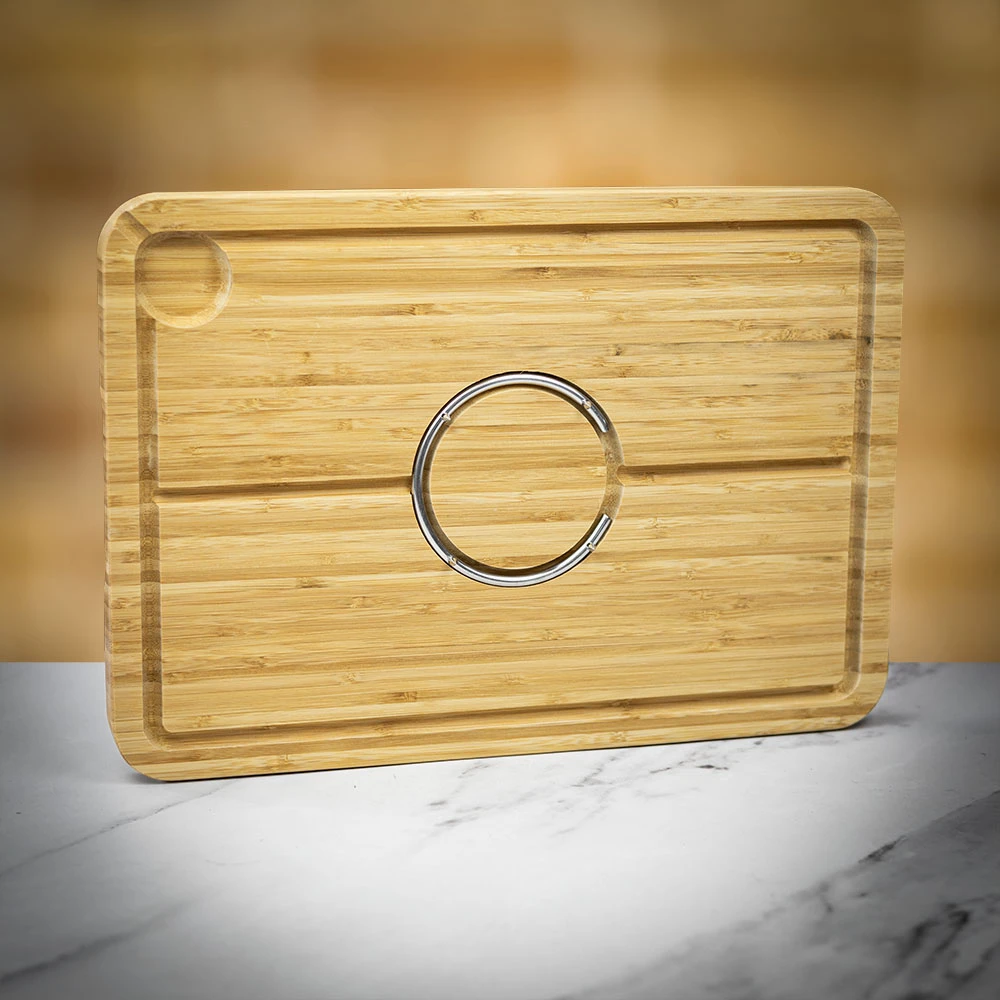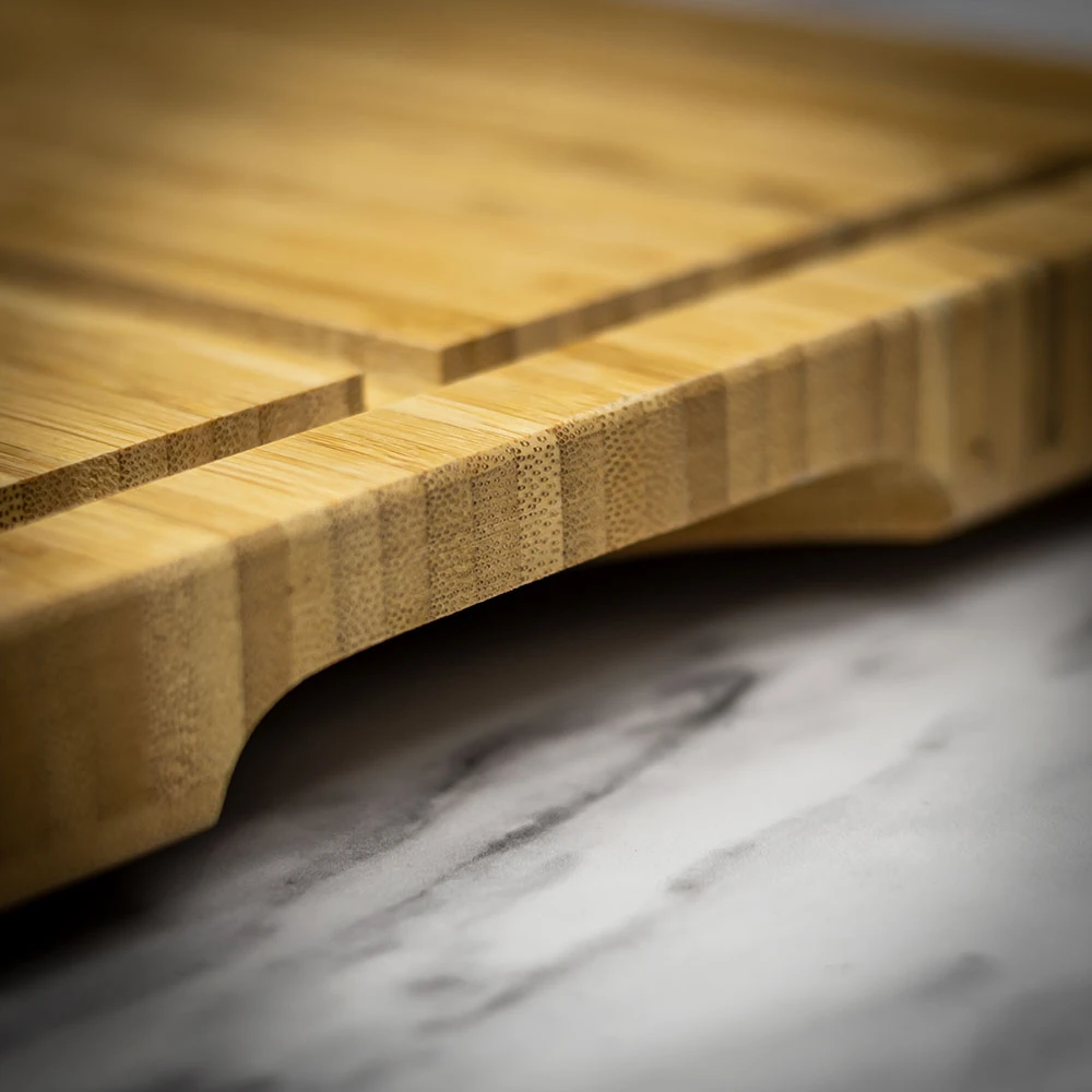 This deluxe heavy weight board, made from high quality bamboo, features a removable stainless-steel ring with spikes which can be secured and stored safely on the underside. The spikes will hold your meat firmly in place, giving stability while you carve. Channelled grooves and a reservoir collect juices which can be decanted from the board to make a delicious gravy.