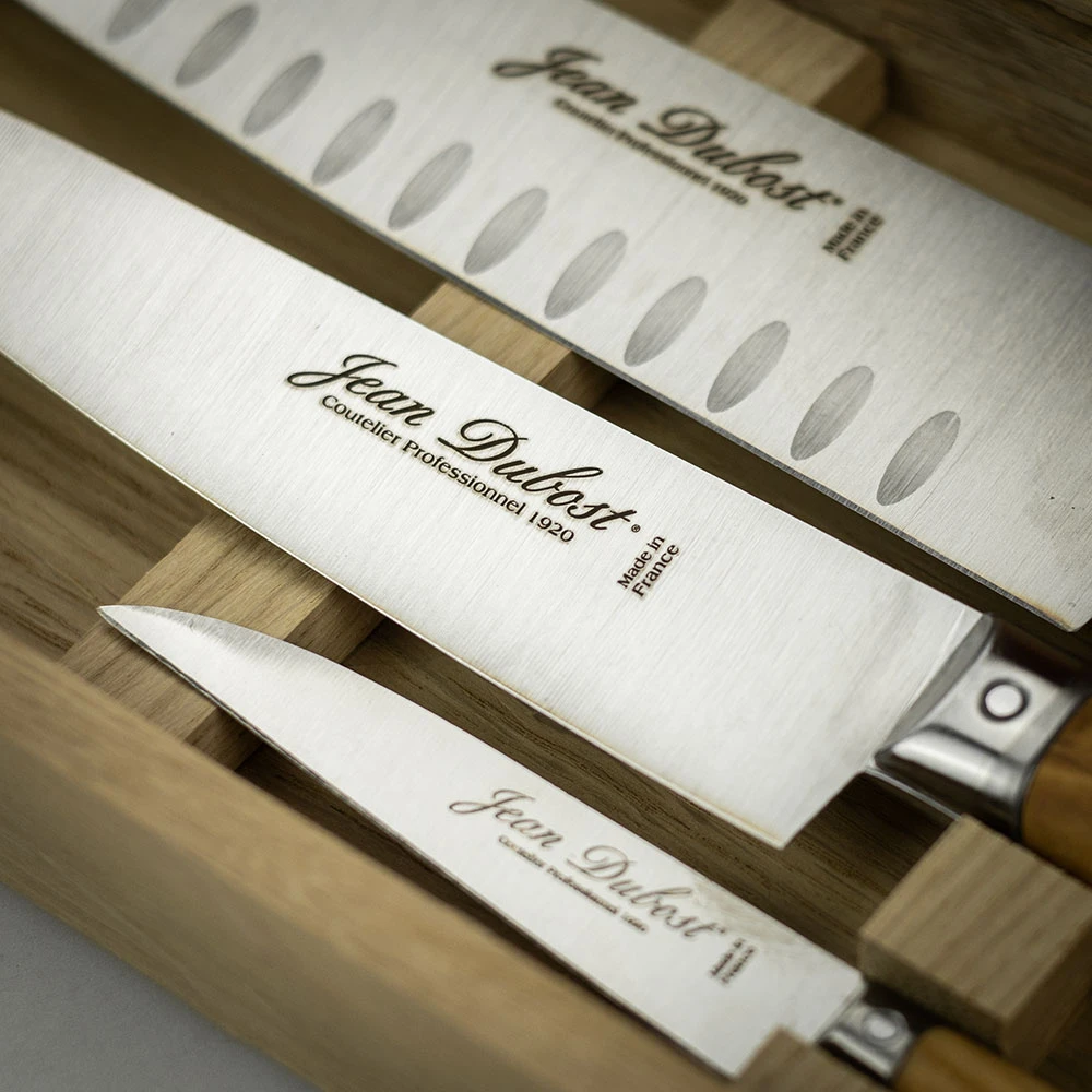 Made using expertise that dates back some 100 years, Jean Dubost knives meet the needs of chefs and amateur cooks alike. Razor sharp full-tang stainless steel blades are triple riveted for strength and the perfectly weighted ergonomic handles are crafted from characterful olivewood.