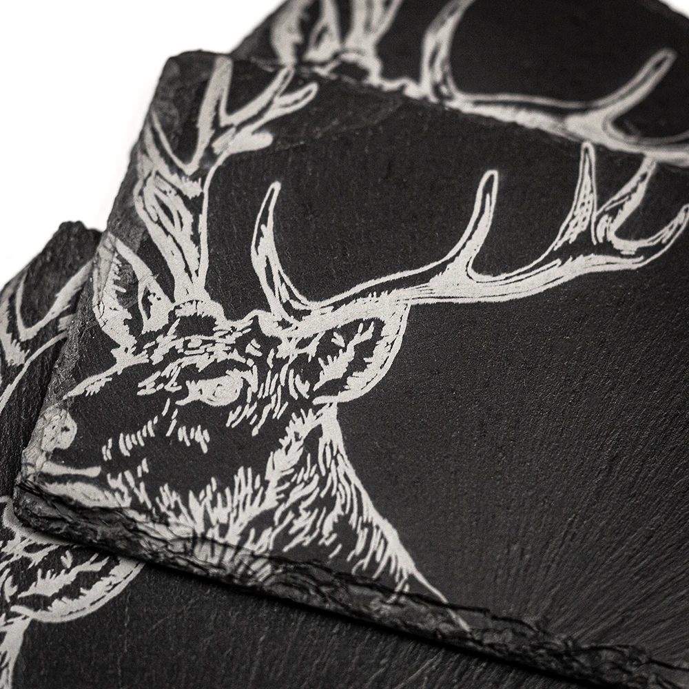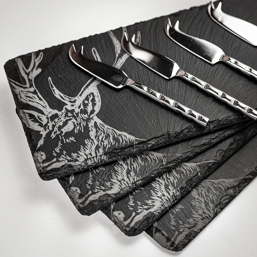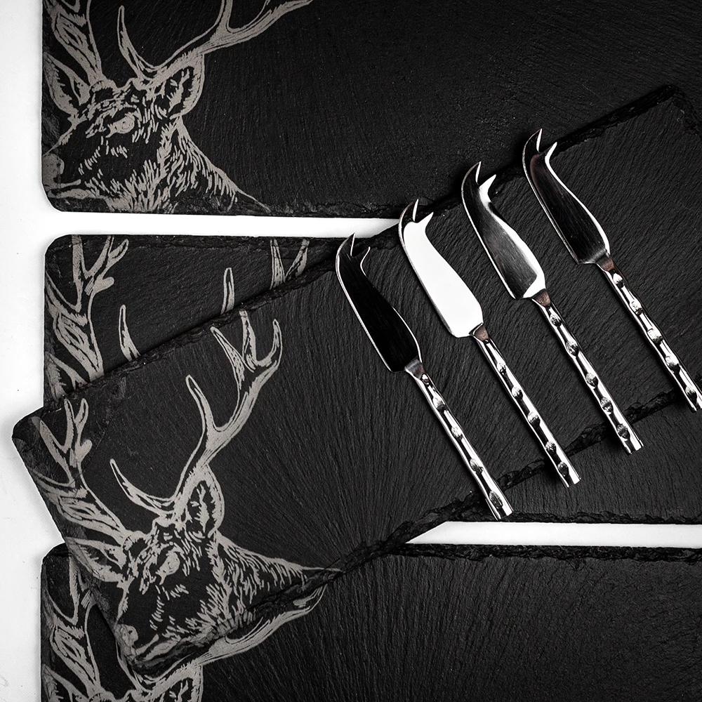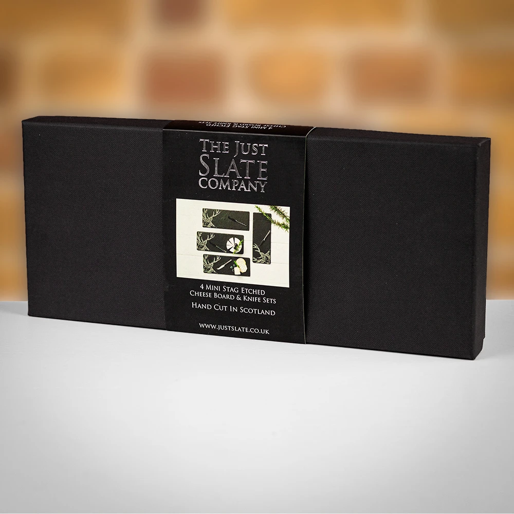 These mini slate cheese boards and stainless steel knives are perfect for a whole host of uses – for individual servings of cheese, canapes, or even desserts – the food display uses are endless. Each cheese board in this set is engraved with our proud stag design, making this quirky little set extra unique. This set is an ideal engagement, wedding, housewarming, or birthday gift presented in a high-quality gift box.
