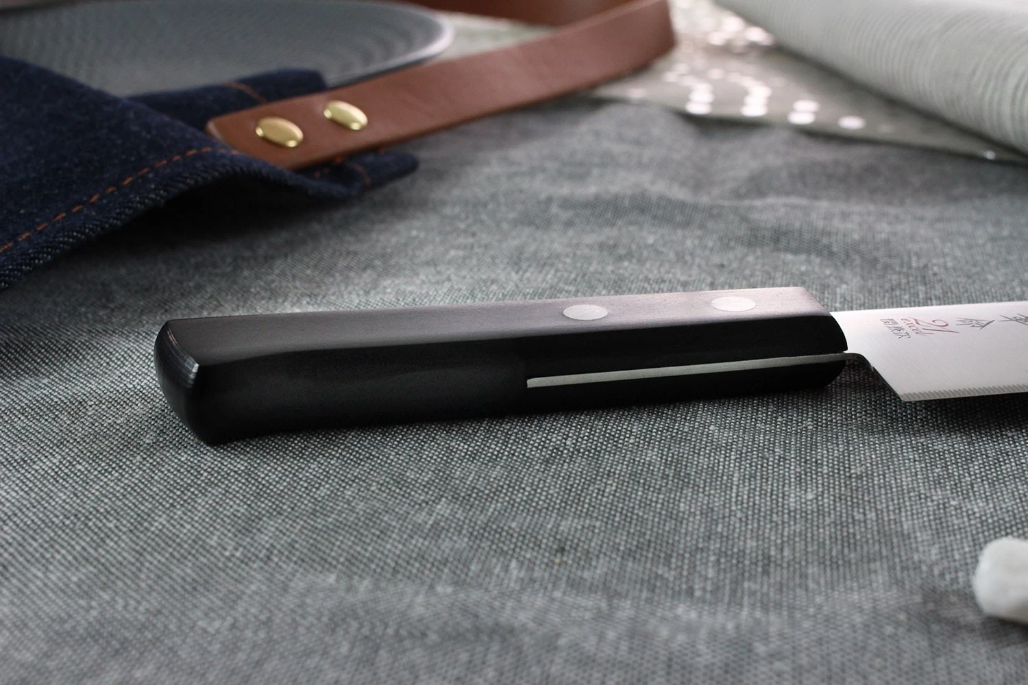 For example, the santoku knife 13.5cm in this page is the perfect type of knife to introduce the Japanese tradition into your kitchen equipment. It is the most polyvalent of Japanese-style knives as it can be used to cut almost every type of food ingredient. Meats, fruits, vegetables, herbs… this knife can do it all, and thanks to its micro-serrated blade, it can also easily deal with foods that have difficult skins such as tomatoes.
