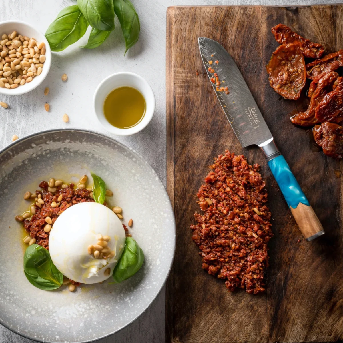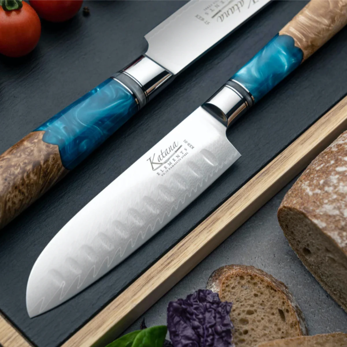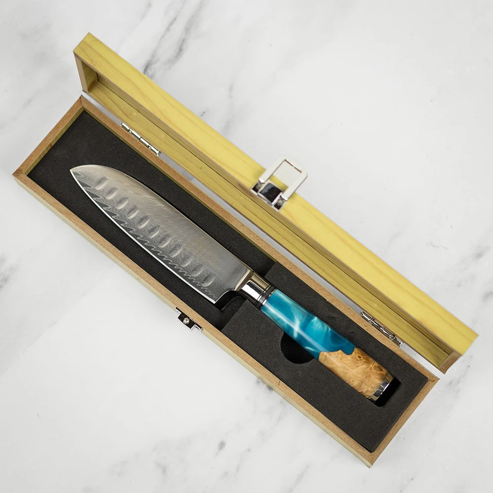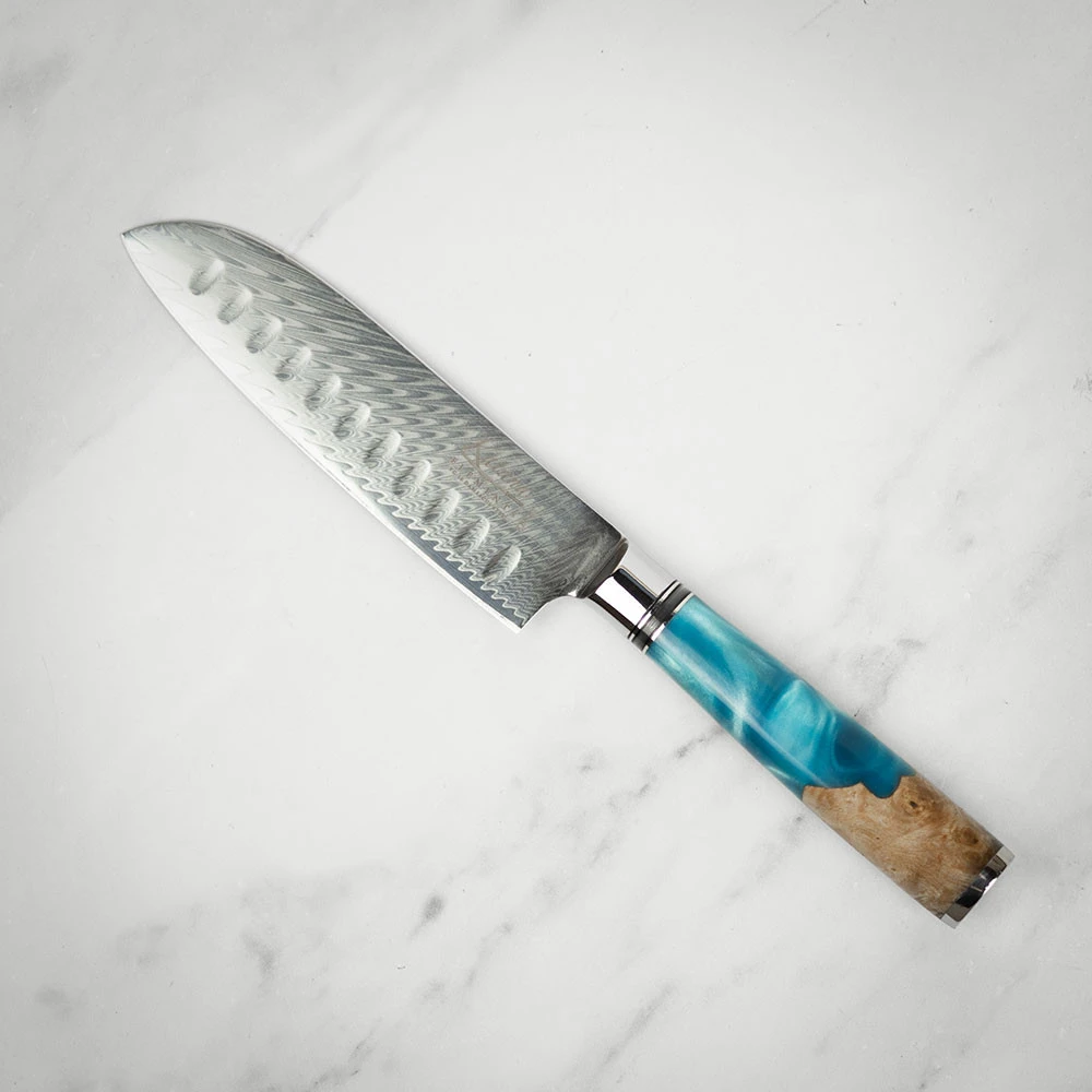 The exquisite craftsmanship in these knives can be seen in the elegant, layered pattern on the blade. The handle is made from olivewood and a blue translucent resin.
