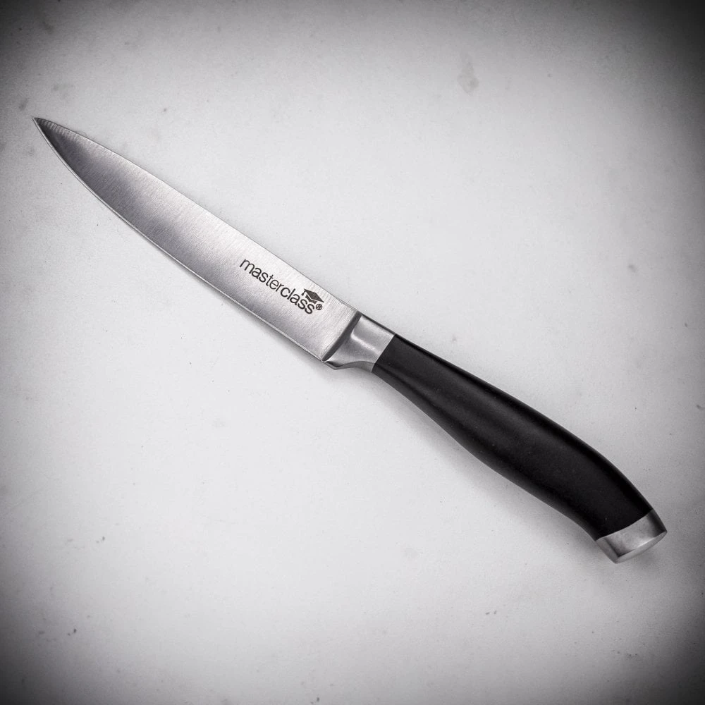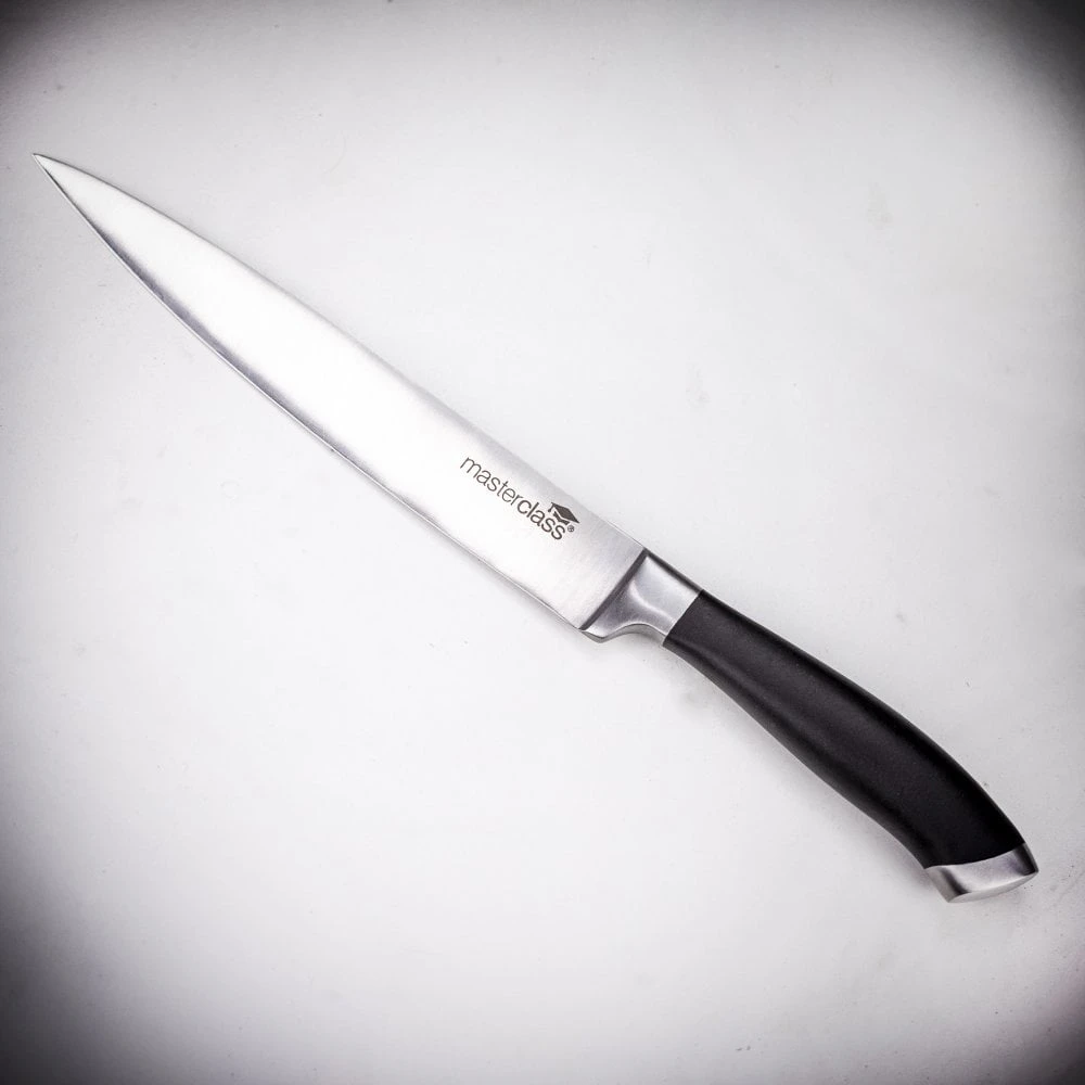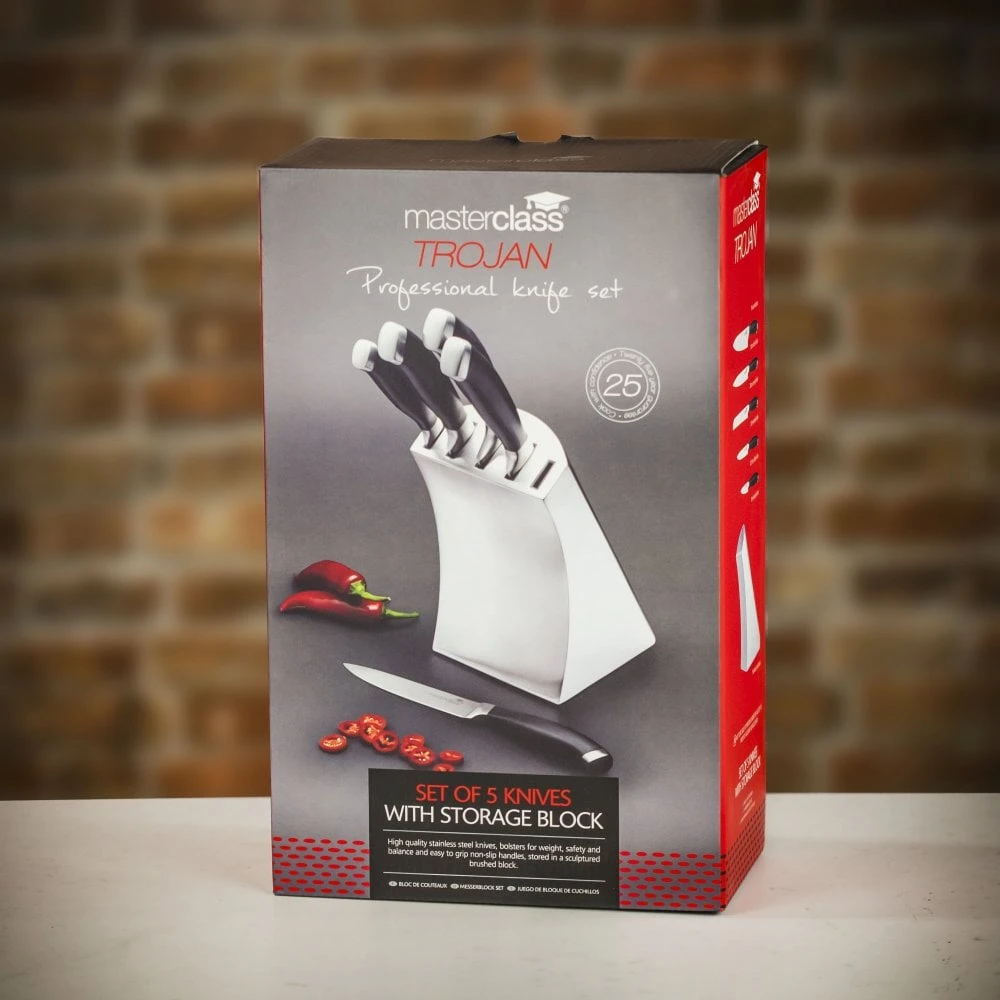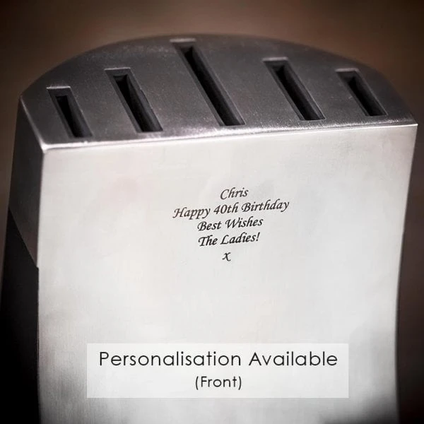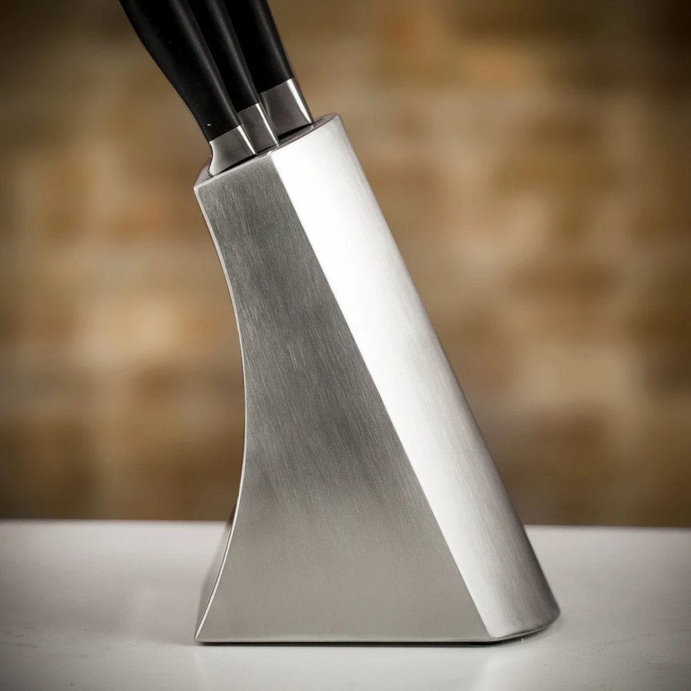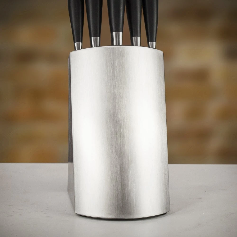 The set includes an 8″ chef knife, 8″ carving, 8″ bread, 5″ utility and a paring knife. These are dishwasher safe and the block can be easily wiped clean.