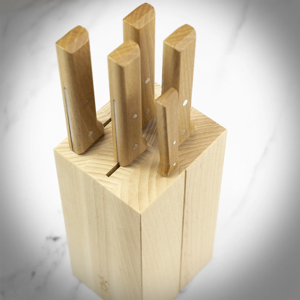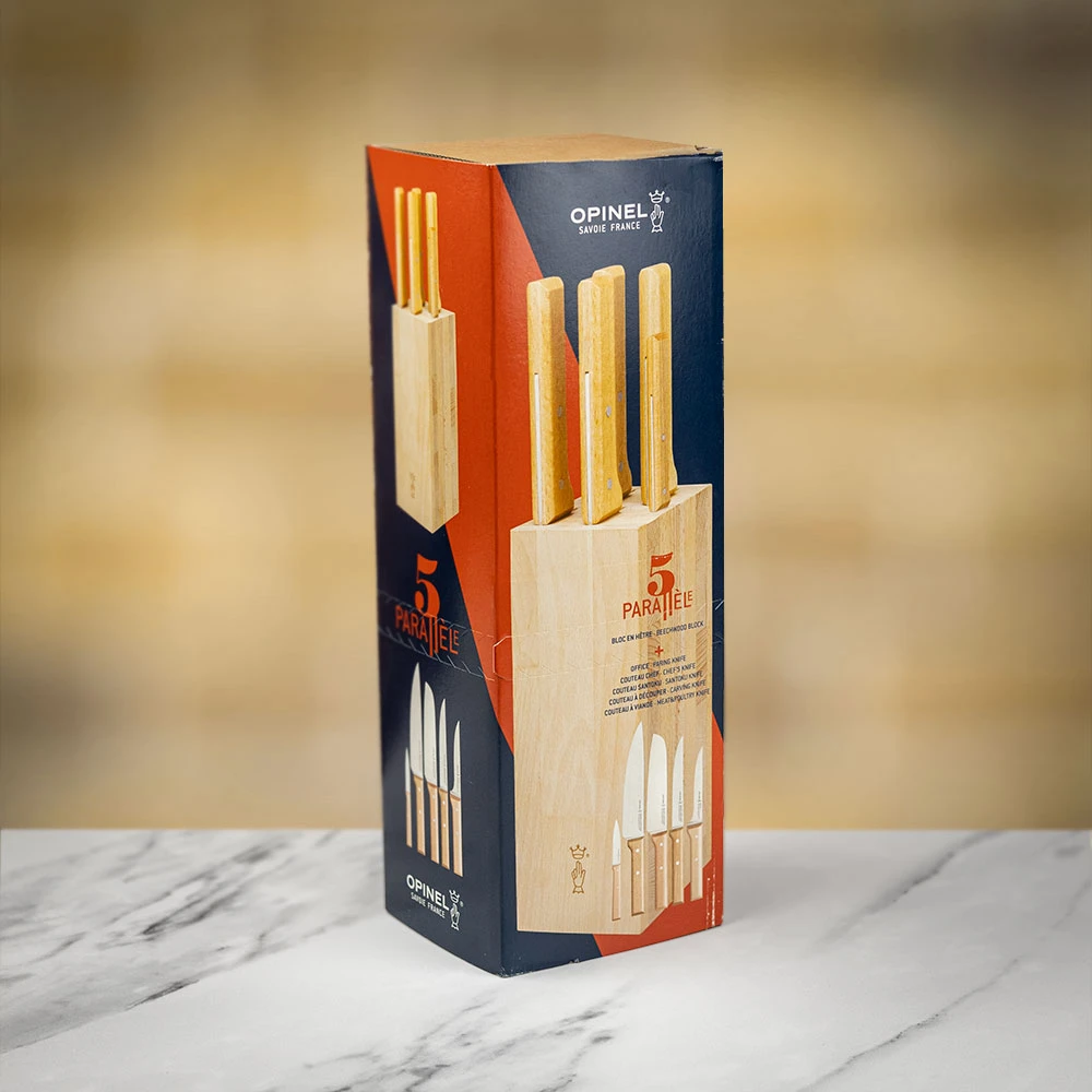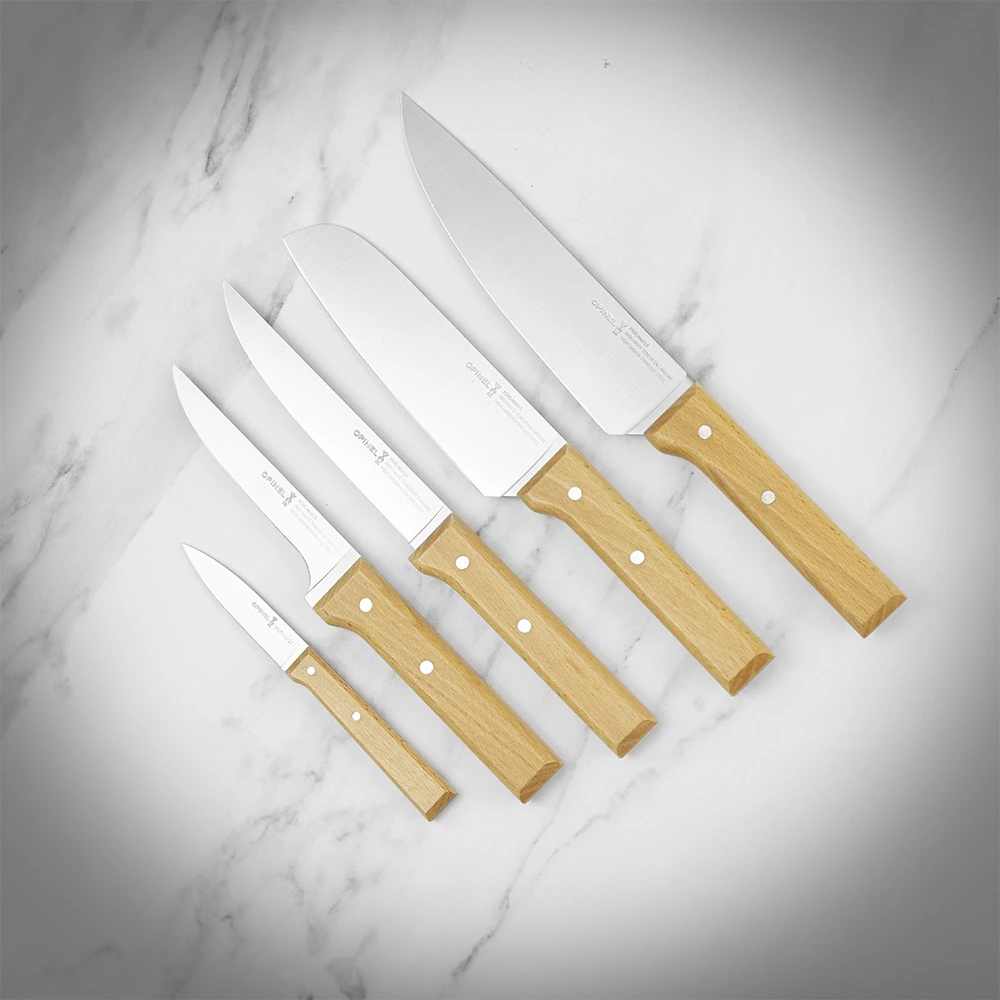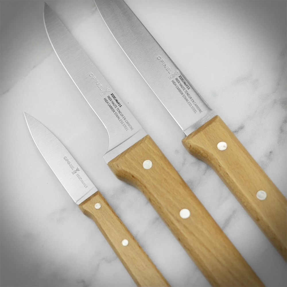 Premium quality stainless steel blades are expertly engineered with a fine taper for precision cutting. The shape of the handles echoes the lines of the wooden blanks used to make Opinel knives.