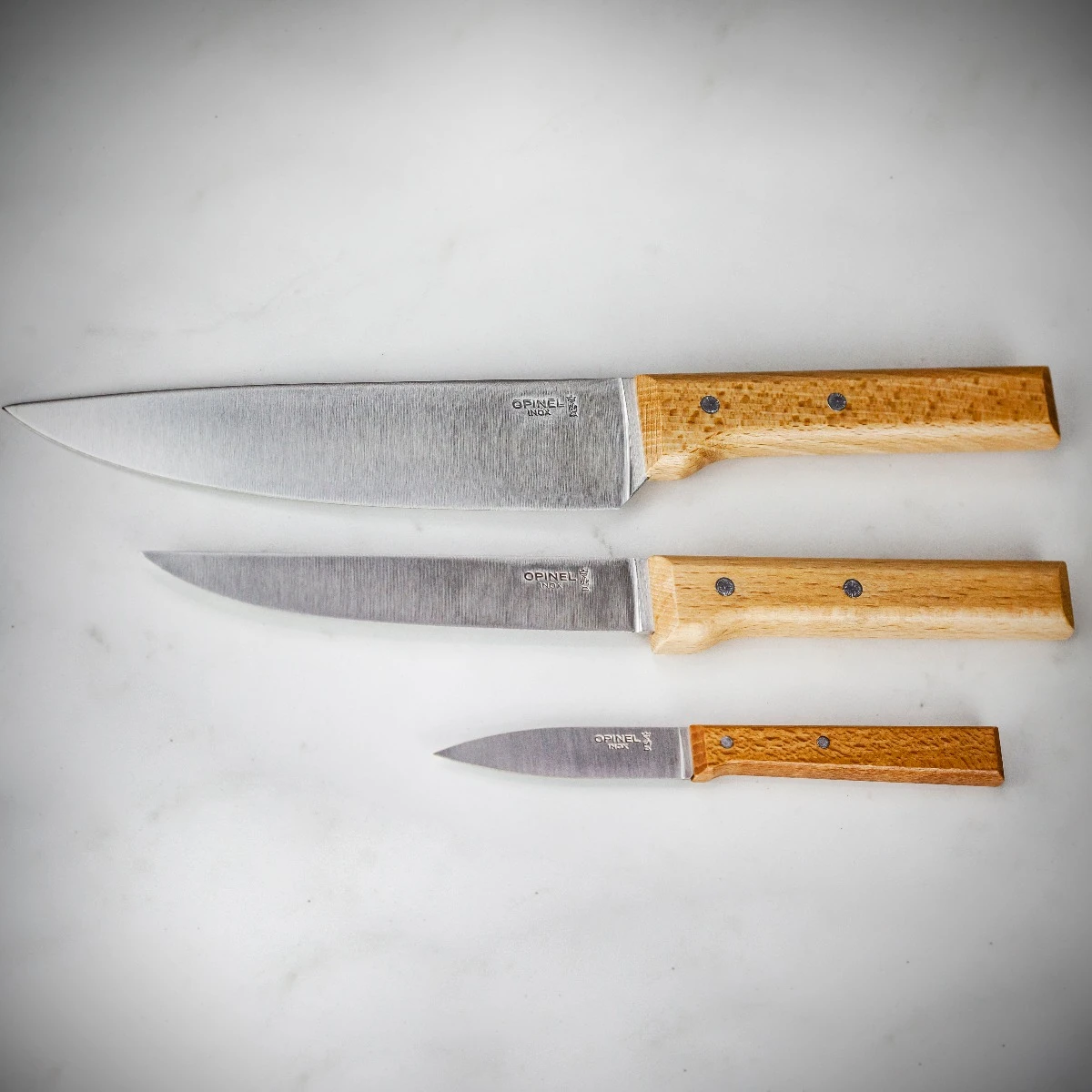 The perfect set for at home chefs it includes an 8cm paring knife, ideal for peeling and cutting, a 16cm carving knife which is ideal for carving meats but also for fruits and vegetables, and a 20cm chef’s knife with a curved blade to allow see-saw chopping movements. A beautiful set for established and aspiring chefs.