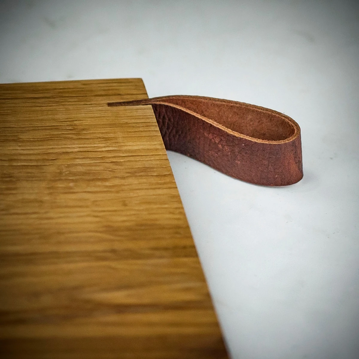 The rustic leather handle is ideal for hanging the board within easy reach and makes it part of your kitchen decor.