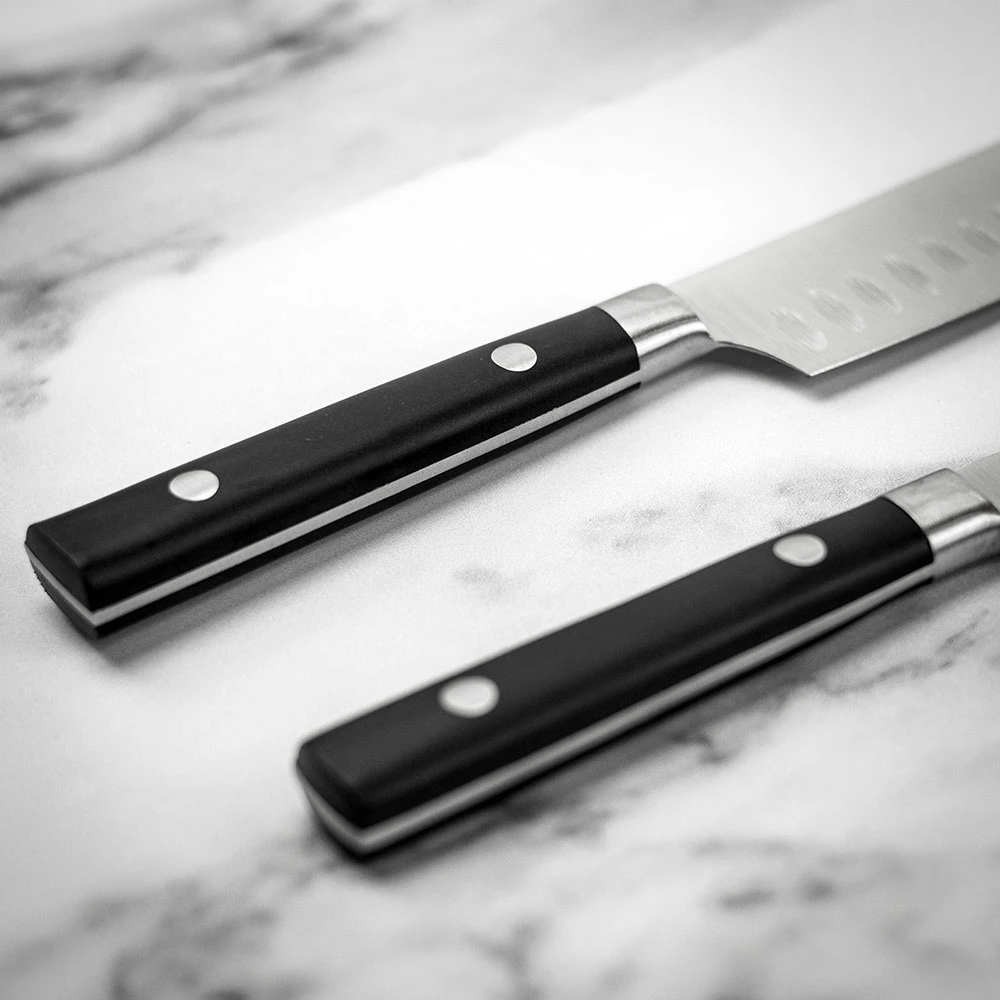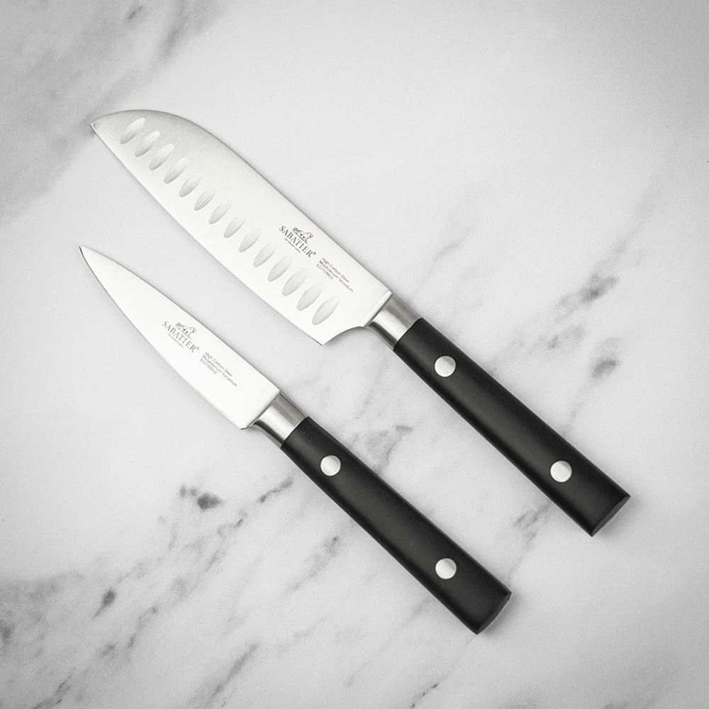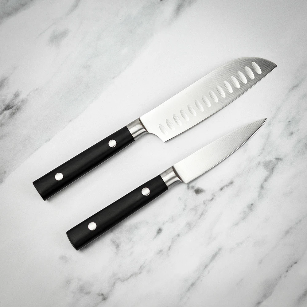 Entirely French made, this elegant duet is made up of a 9cm professional paring knife perfect for peeling, slicing fruit and vegetables, or even to score skin on meat such as pork for delicious and crispy crackling; and a 12cm Mini Santoku knife with a high-quality blade that makes it ideal for slicing onions, fish, and meat.
