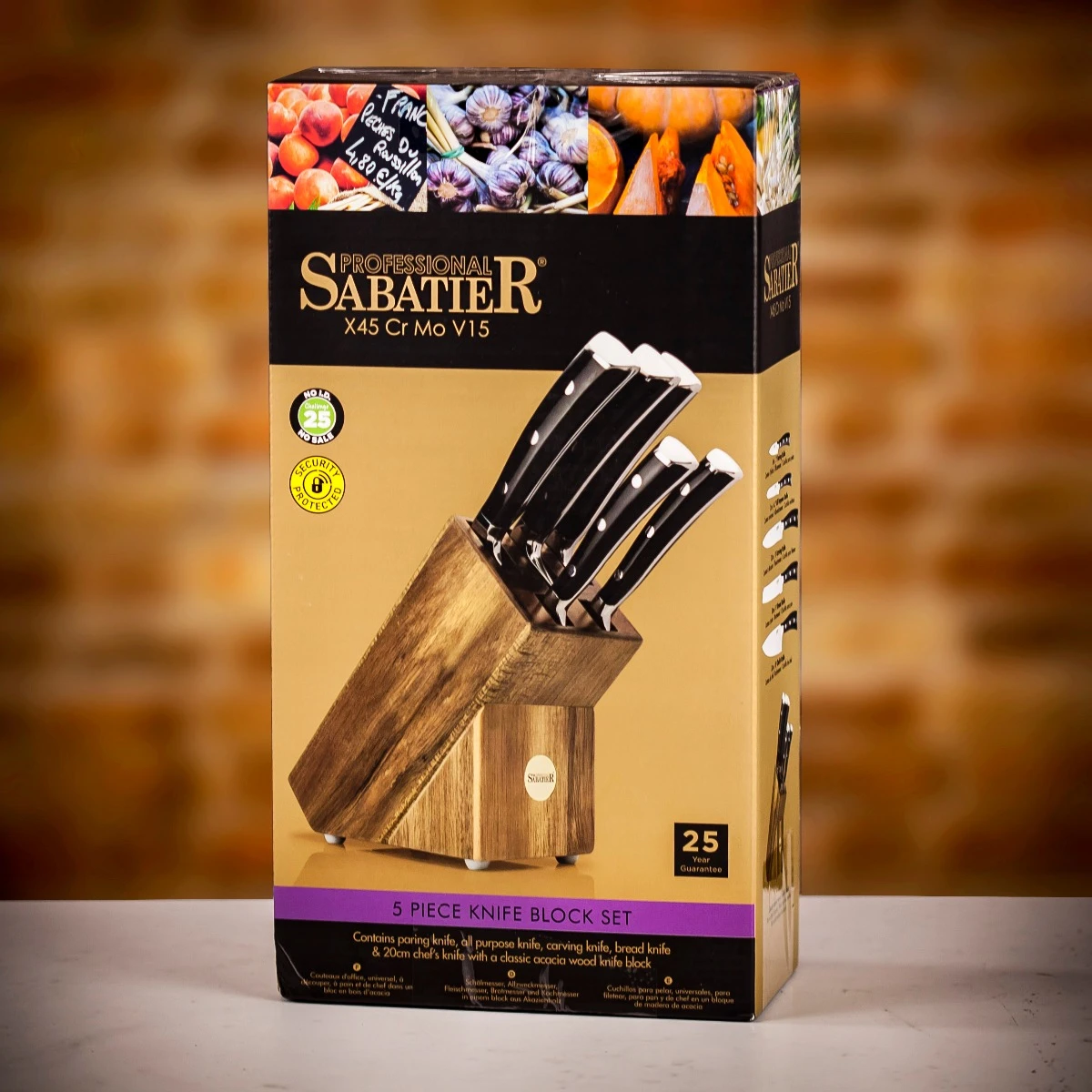 This set features the following: paring knife, multi purpose knife, carving knife, bread knife and 20cm chef’s knife. All Sabatier Professional knives have a 25 year warranty.