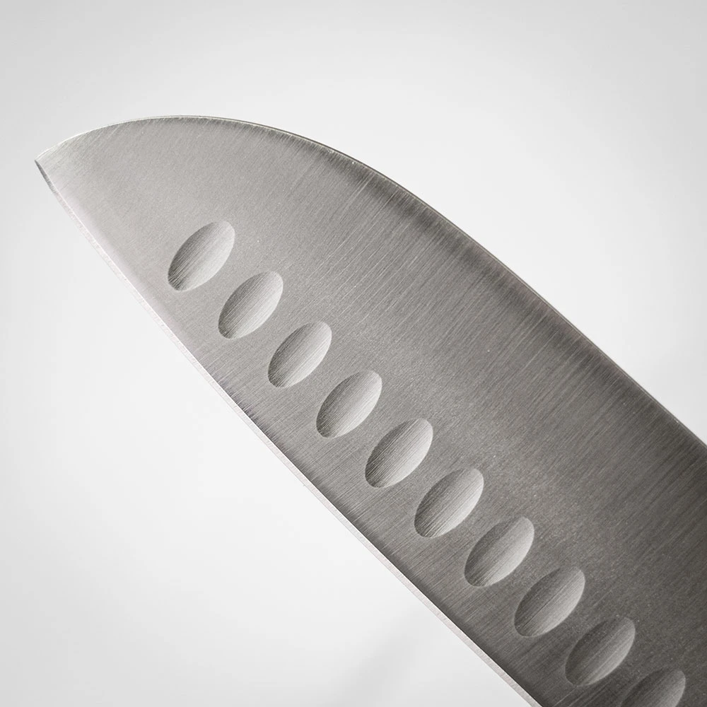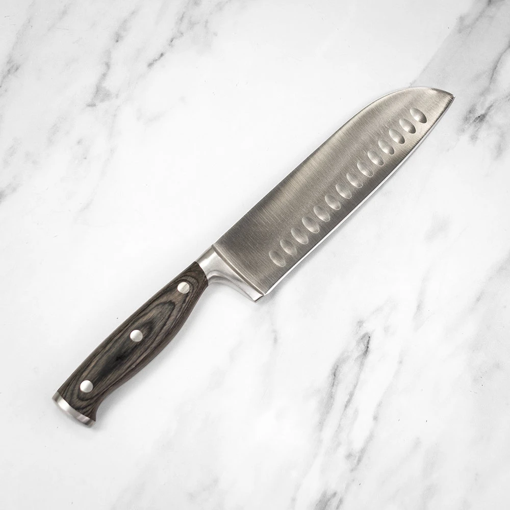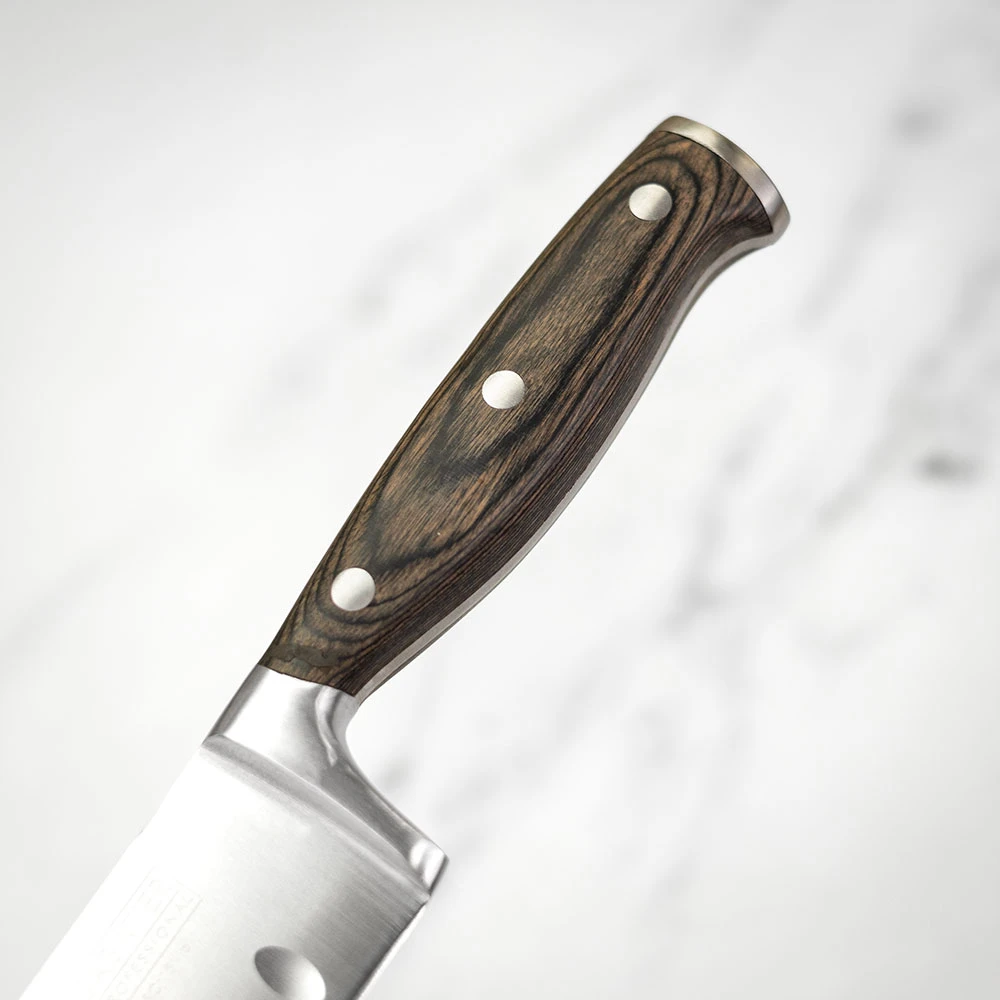 The knife is stamped from 5Cr15MoV chrome-molybdenum-vanadium stainless steel, then individually sharpened, honed, and smoothed by hand. The blade runs full-tang and boasts superior edge retention. Classically contoured, the attractively grained pakkawood handle is a triple riveted handle that fits perfectly in the hand for effortless control.