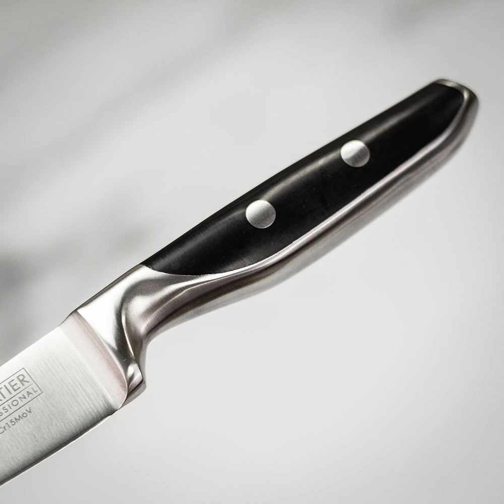 Each knife is stamped from 5Cr15MoV chrome-molybdenum-vanadium stainless steel, then individually sharpened, honed, and smoothed by hand. The blades run full-tang and boast superior edge retention. Ergonomically contoured, twin riveted handles fit perfectly in the hand for effortless control.