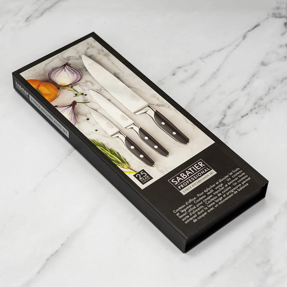 The paring knife will take care of intricate, precision work such as peeling and de-seeding. The multi-purpose non-serrated utility knife is ideal for slicing small to medium fruits and vegetables like tomatoes, onions, carrots and potatoes, and Chef’s knife will handle tougher cuts such as larger root vegetables and squashes as well as meats and fish with ease.