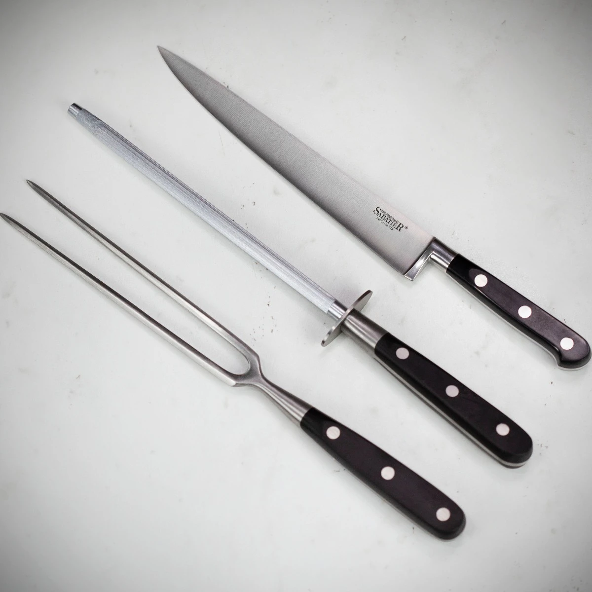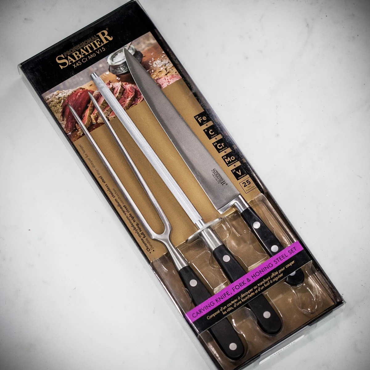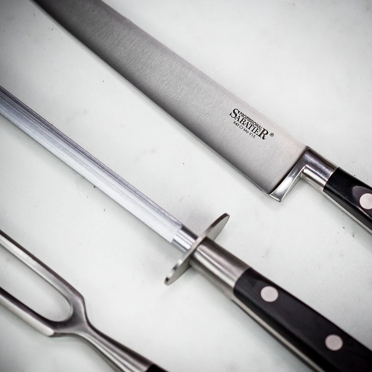 Constructed for durability, the Professional Sabatier range features high quality steel blades and carefully shaped handles. The set includes a carving knife, fork and honing steel.