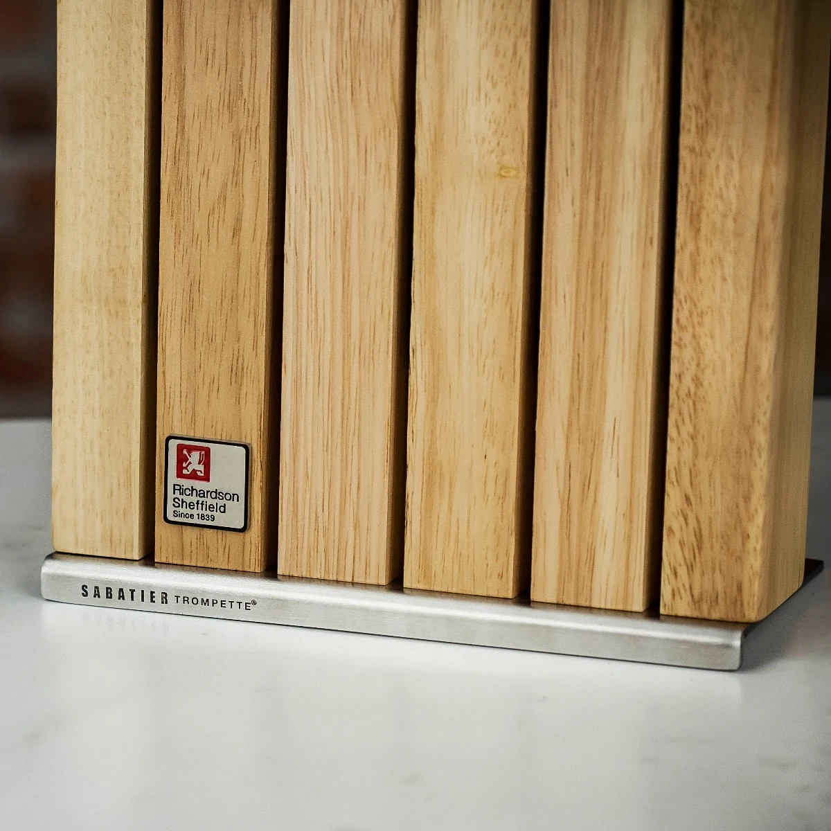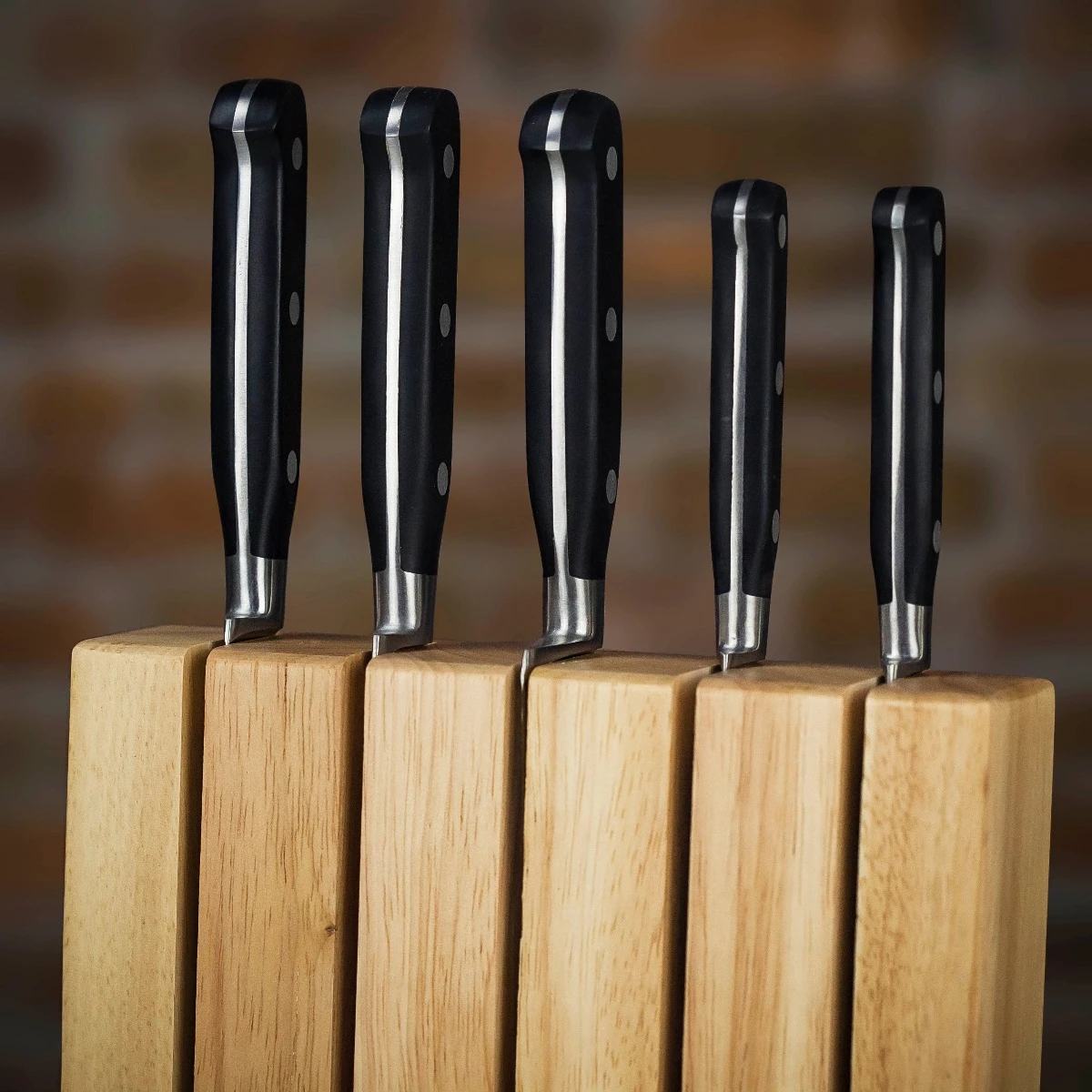 The quirky knife block makes a feature of the knives creating a modern addition to your kitchen. Full tang blades with a tapered edge are crafted from the finest quality steel to give you effortless, precision cutting with every use. The set includes a paring knife, multi-purpose knife, chef’s knife, carving knife, bread knife and a wooden block.