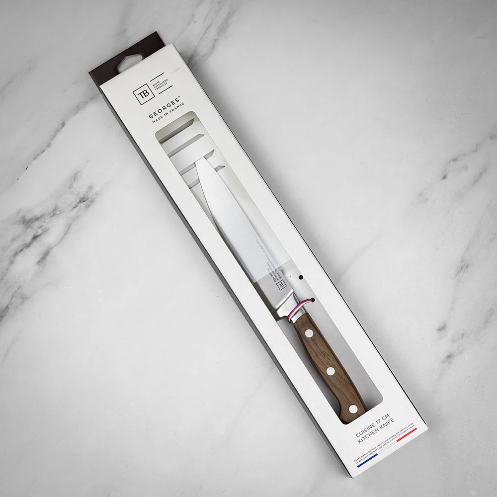 Made In France, its 17 cm full tang blade in Nitrox stainless steel is lightweight yet sturdy. The Louis Kitchen Knife offers superior strength and is beautifully balanced. It has a sleek modern aesthetic featuring an ergonomic walnut handle with a comfortable grip.