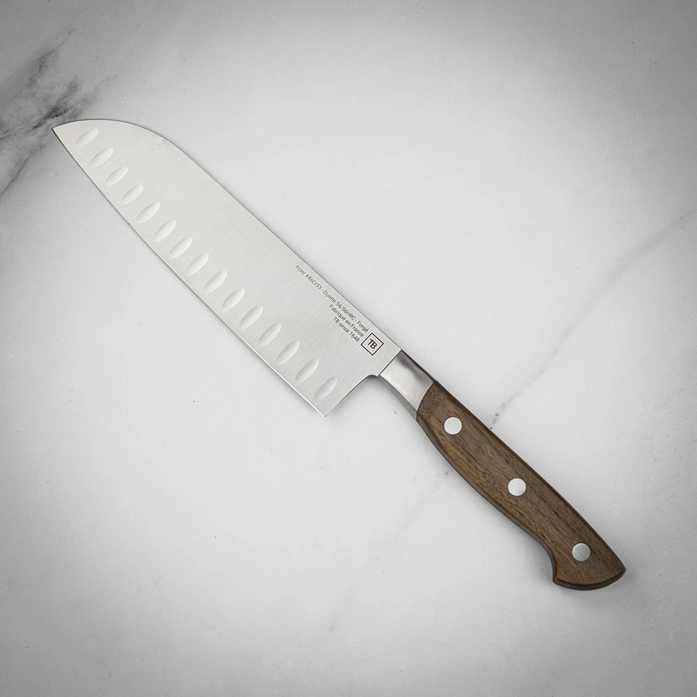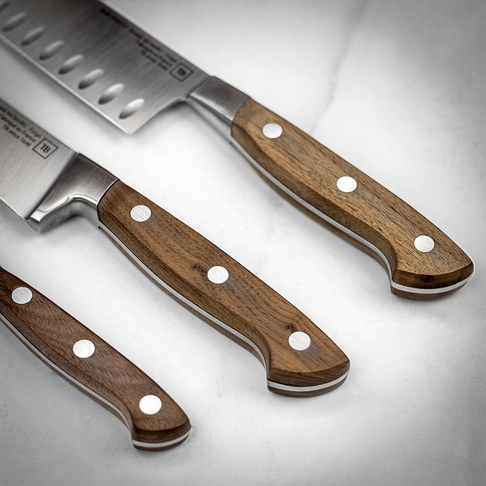 Featuring a santoku, a paring knife and a kitchen knife, this useful trio each have a forged stainless-steel blade which is full tang and triple riveted for superior strength and an ergonomic walnut handle with a comfortable grip.