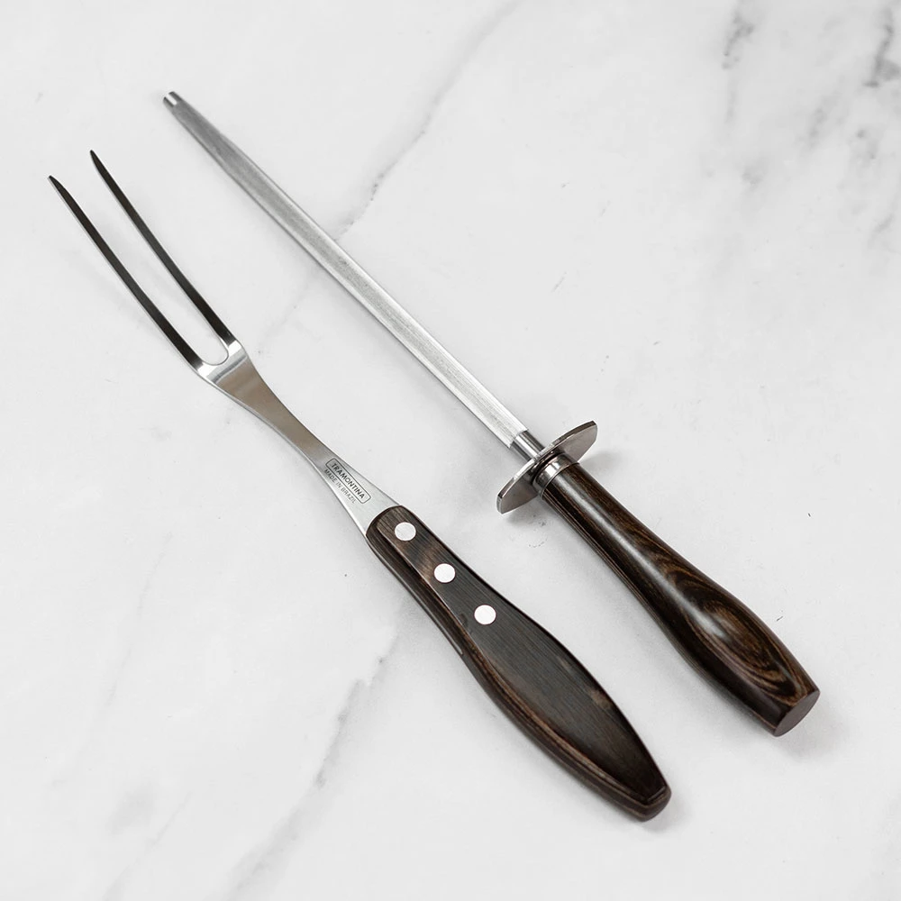 Featuring super-sharp stainless steel blades, curved fork tines, and sturdy handles with aluminium rivets for safety and style. Plus, a chrome-plated carbon-steel rod for knife sharpening.