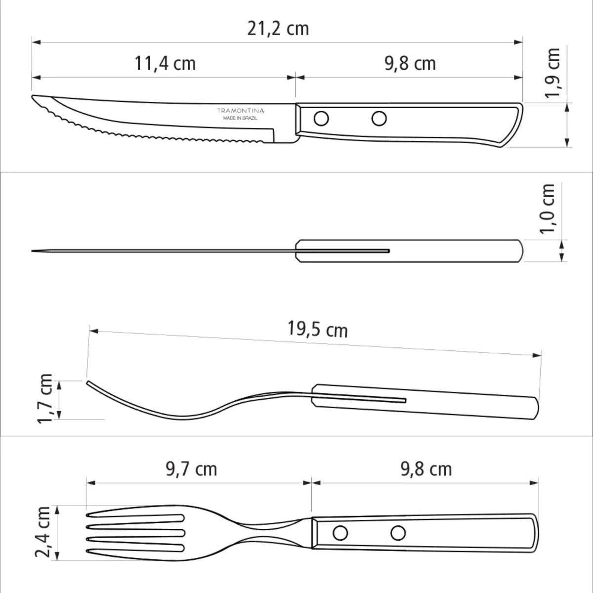 - Steak knife: L:21.2cm x W:1.9cm x H:1cm