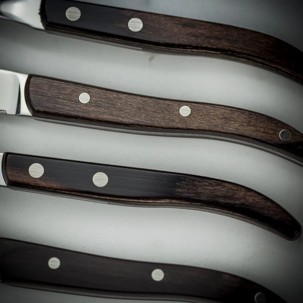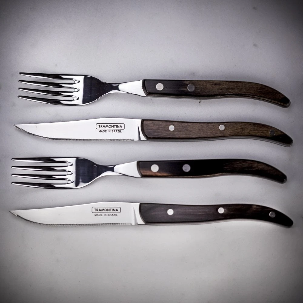 This set of 2 premium knives and 2 forks are made from mirror polish stainless steel. Full-tang and triple riveted, the micro-serrated blade on the steak knife ensures you can always cut with ease no matter how well done you like your steak. The French styled, ergonomic, gently curved, FSC certified polywood handles are perfectly balanced, a pleasure to hold and makes these steak knives and forks conveniently dishwasher safe.