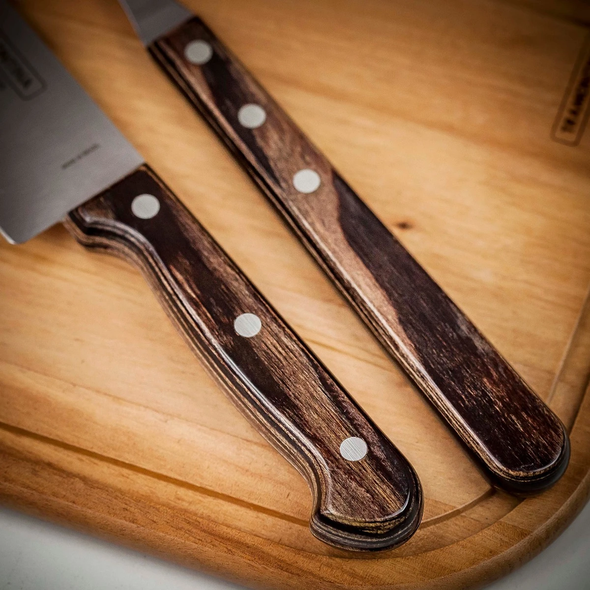 Featuring the must-have tools you’ll need for BBQ season. The stainless steel blade carving knife is perfect for slicing your barbecued rump, and a gently curved tine fork gives stability as you carve. The wooden board is made from Brazilian Muiracatiara wood and has a rich, characterful grain. Perfect for preparation to presentation.